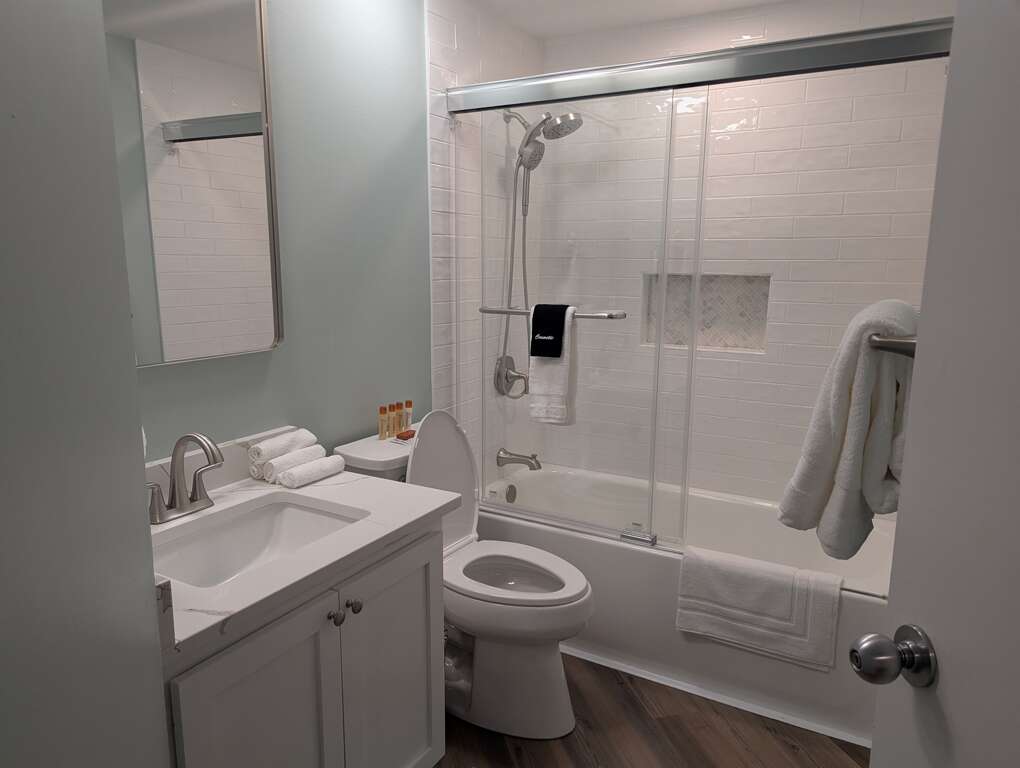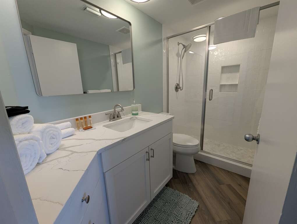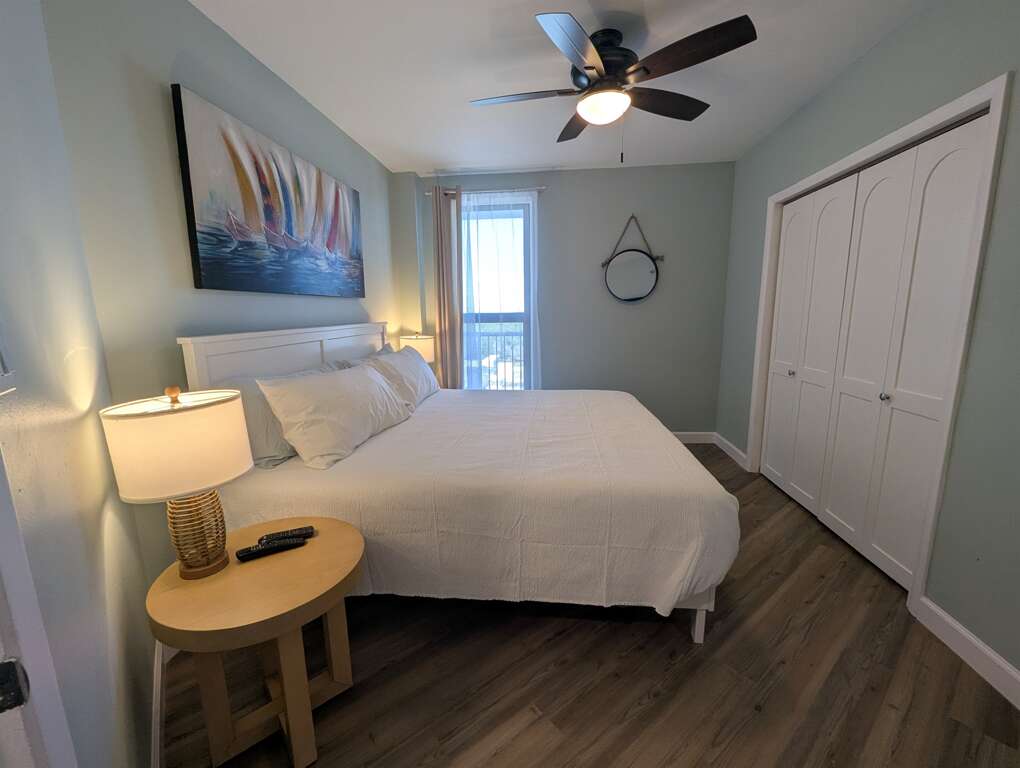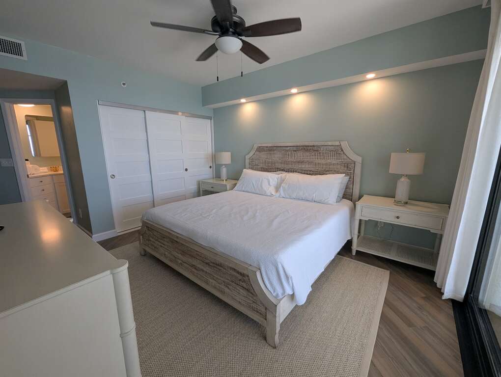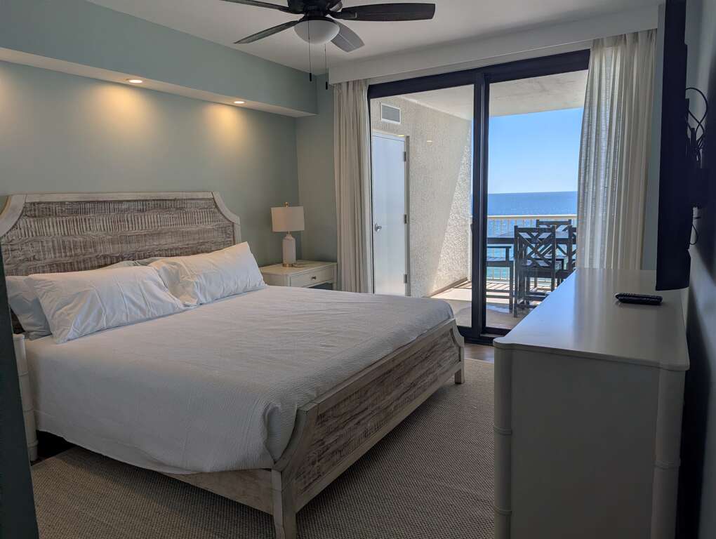 The master bedroom has a comfortable King sized bed for your retreat after a day of sun and sand and has a private master bathroom with an updated walk in shower with a high end glass enclosure.