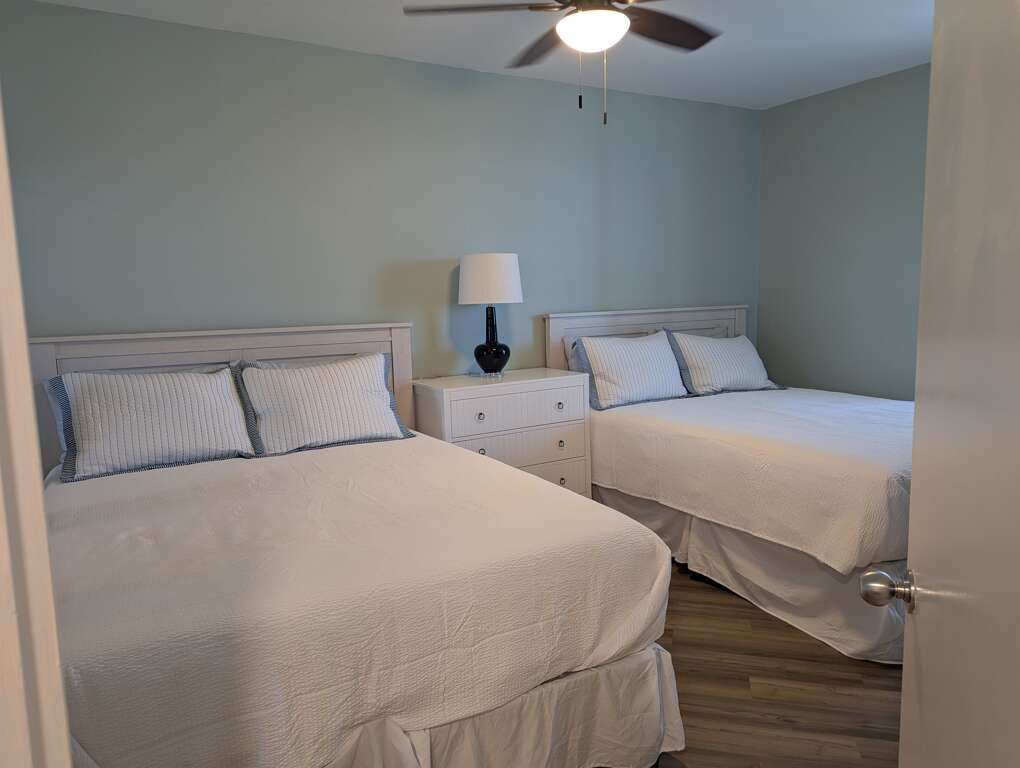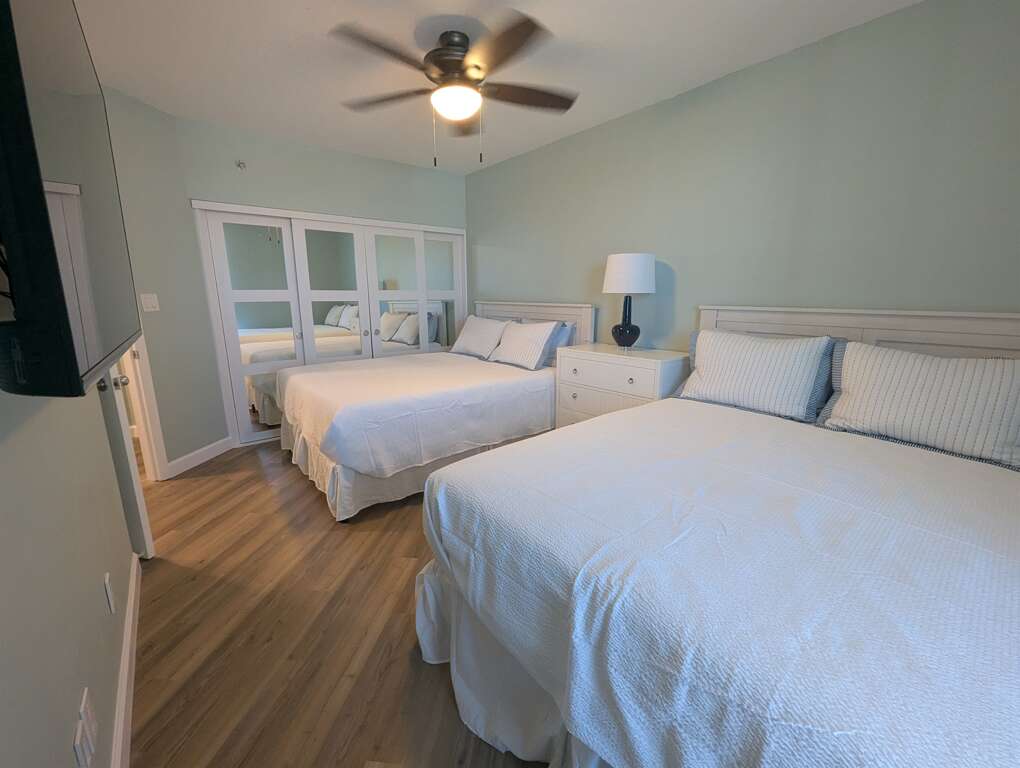 The other two bedrooms and bath are located on a separate wing off the kitchen. One bedroom has a plush King bed and the other is equipped with two Queen beds. The guest bathroom also features a tub/shower combo.