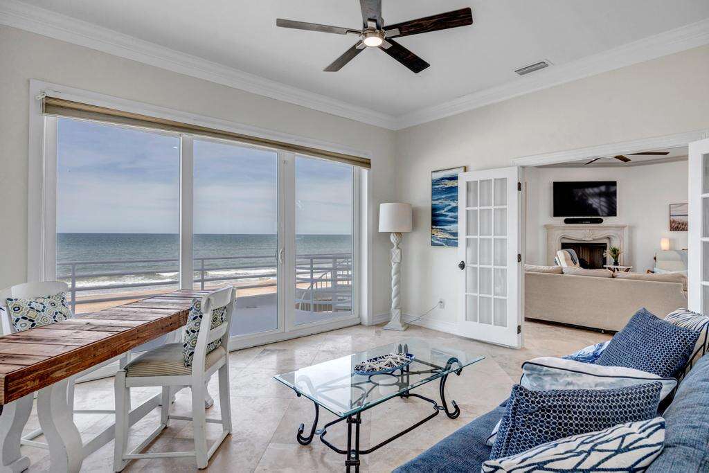 Soft coastal light fills the rooms as waves roll along the shoreline just beyond the beachfront deck. Breezes drift through tall windows, carrying the scent of the Atlantic while you settle into unhurried moments on the balcony or gather in the open living area. From morning views over the water to quiet evenings with the tide below, the home keeps you connected to the beach throughout your stay. Sorry, No Pets.