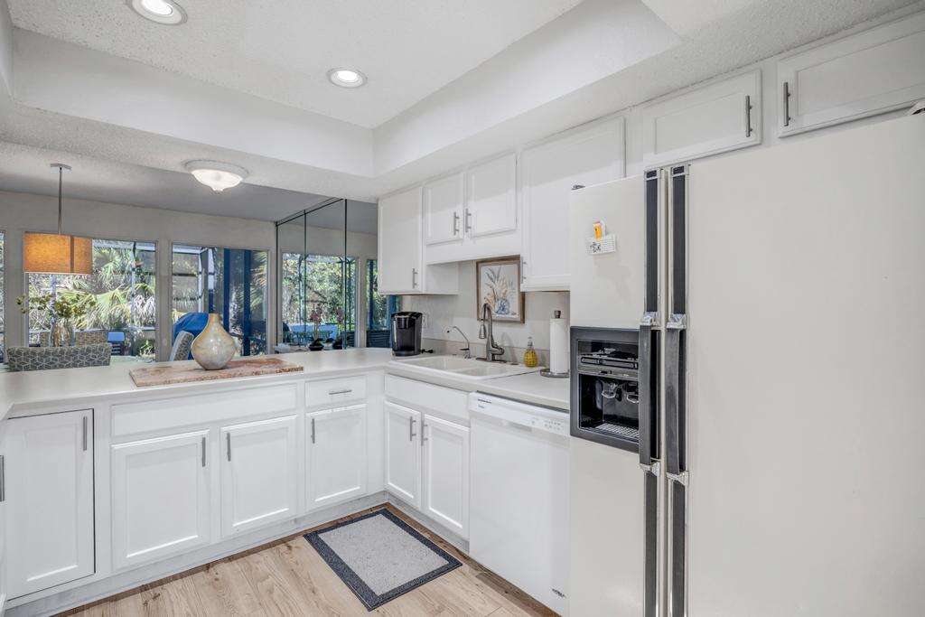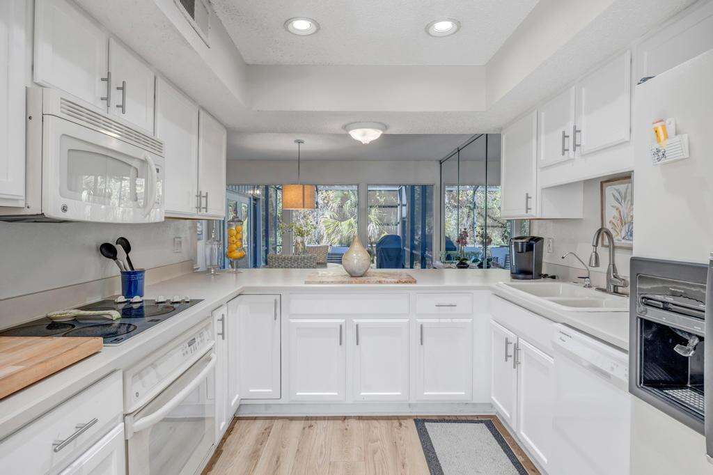 Inside, warm tones and vintage Florida charm make the open living area an inviting space to relax. Comfortable seating, natural light, and views of lush greenery create a soothing retreat. Ceiling fans, air conditioning, and heating ensure comfort in every season, while Wi-Fi and TVs in the LR and each bedroom provide entertainment when you want to unwind in your owner space.