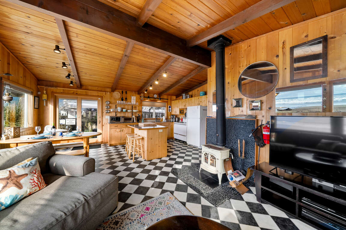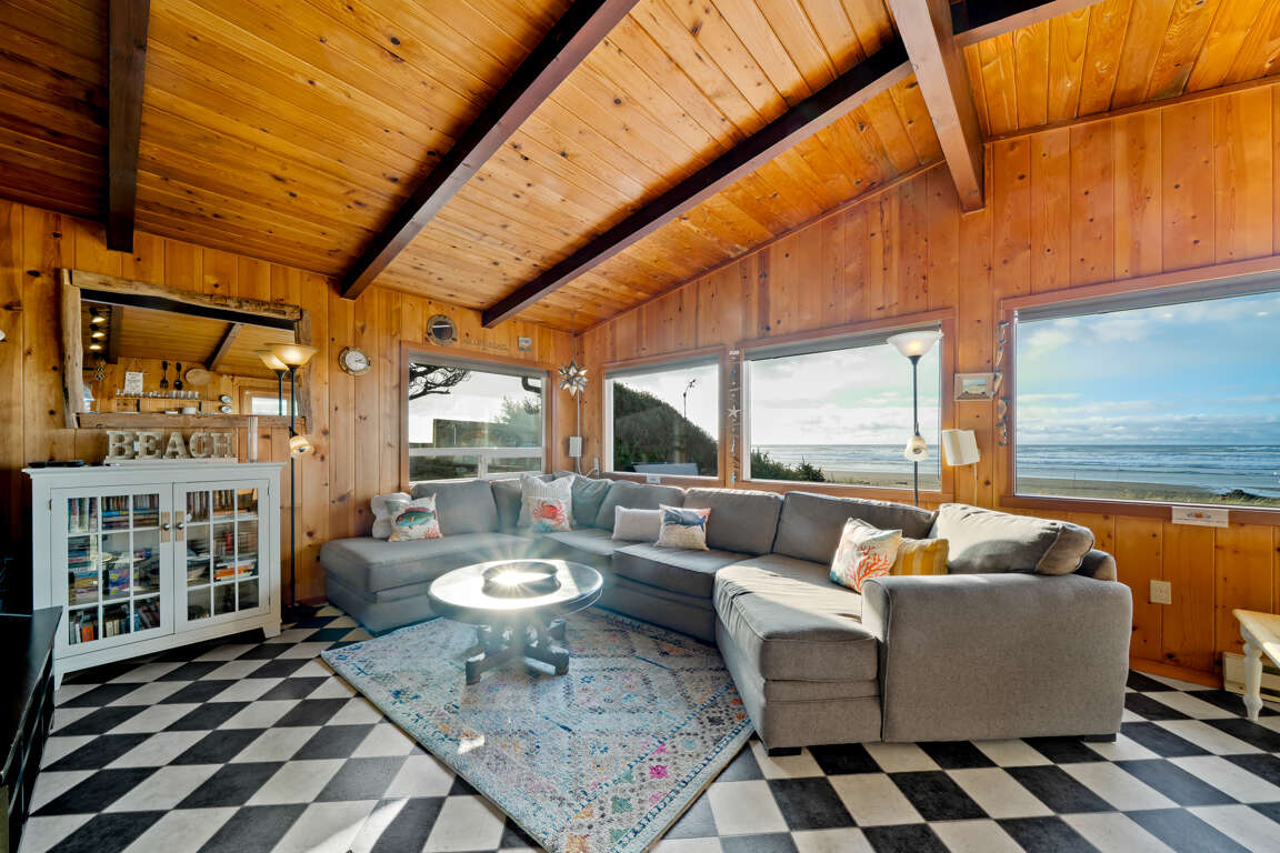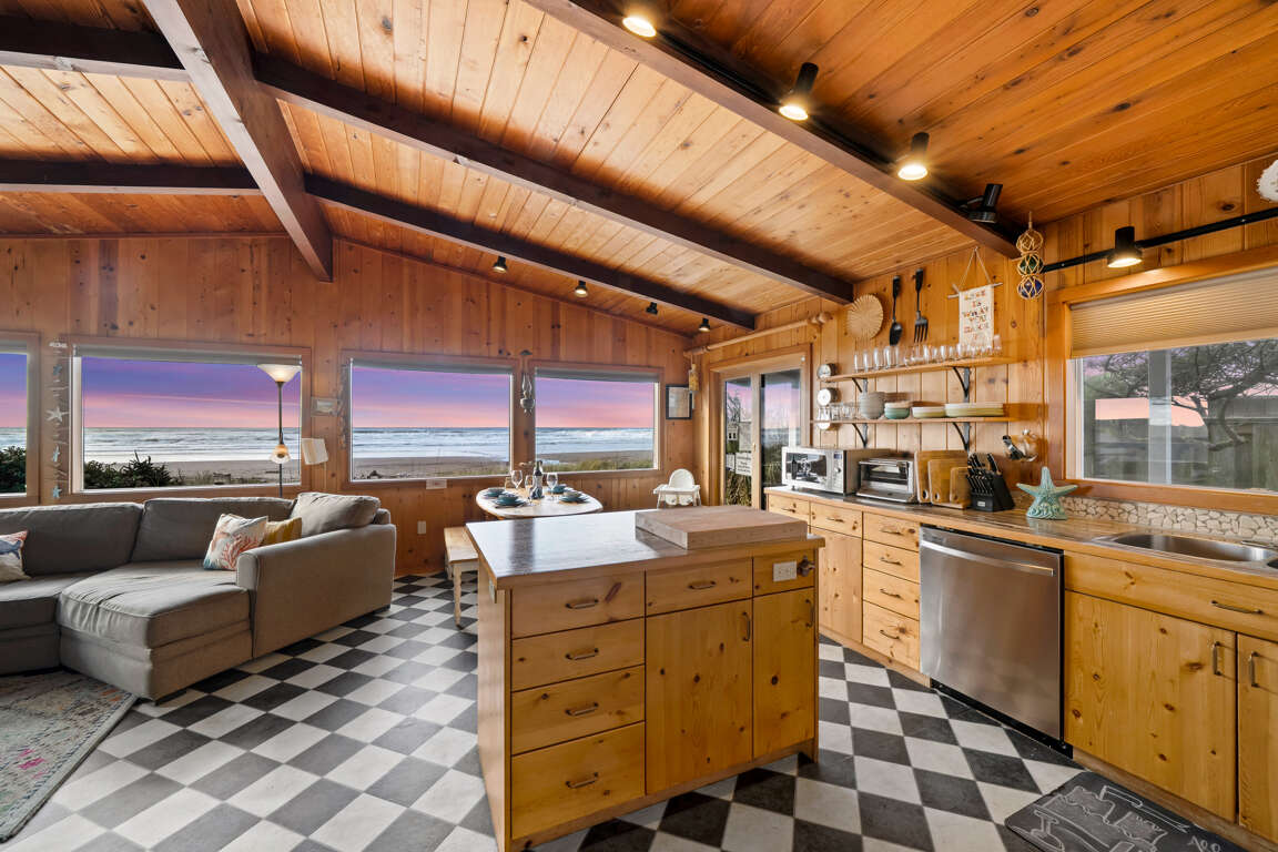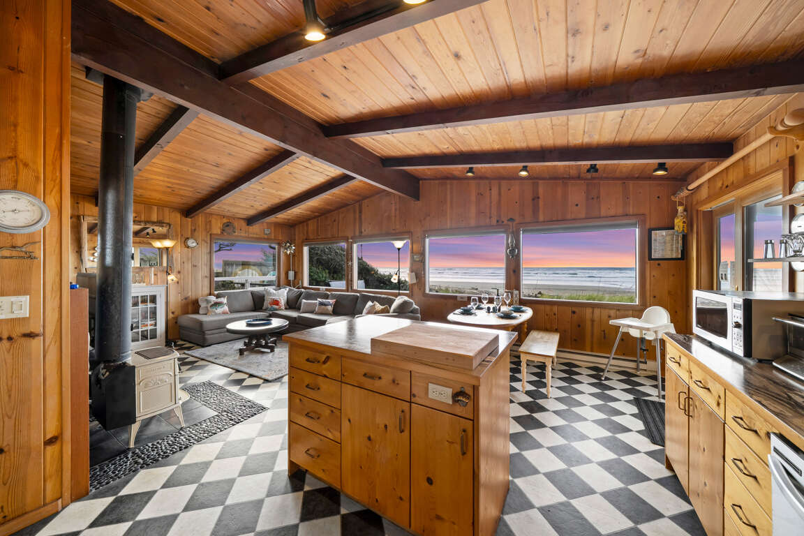 Beyond the captivating views, this vacation home offers a plethora of outdoor spaces to savor the coastal ambiance. The large back deck, looking out to the ocean, is complemented by an inviting in-ground hot tub and a cozy fire pit with built-in benches, ensuring endless relaxation and enjoyment. The side deck serves as a perfect play area for children or a serene spot for a wind-sheltered picnic. Even from indoors, you'll remain captivated by the mesmerizing scenery, thanks to the open living area with large picture windows framing the beach view. The kitchen, complete with an island and breakfast bar, invites you to socialize and create delicious meals while enjoying the coastal panorama. In the living room, sink into the plush sectional, and be entertained by the large TV with surround sound, featuring Apple TV streaming for your viewing pleasure.