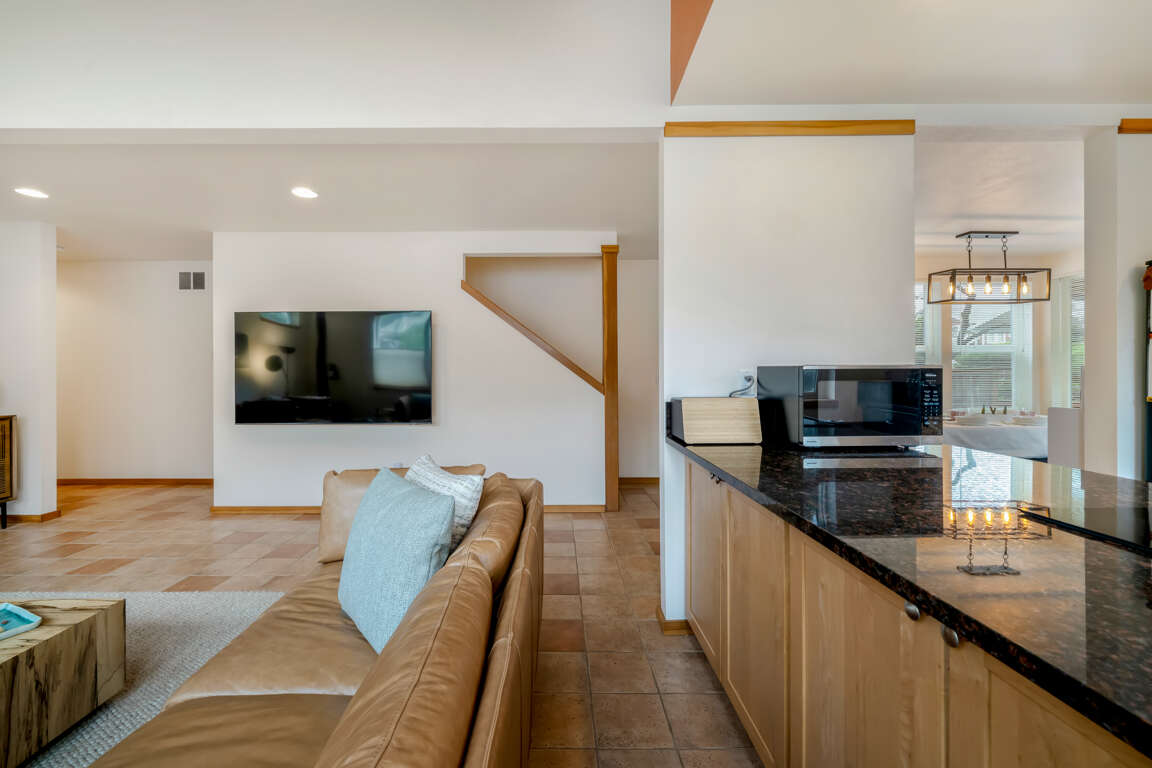 • Open living area with a large sectional sofa and big streaming TV