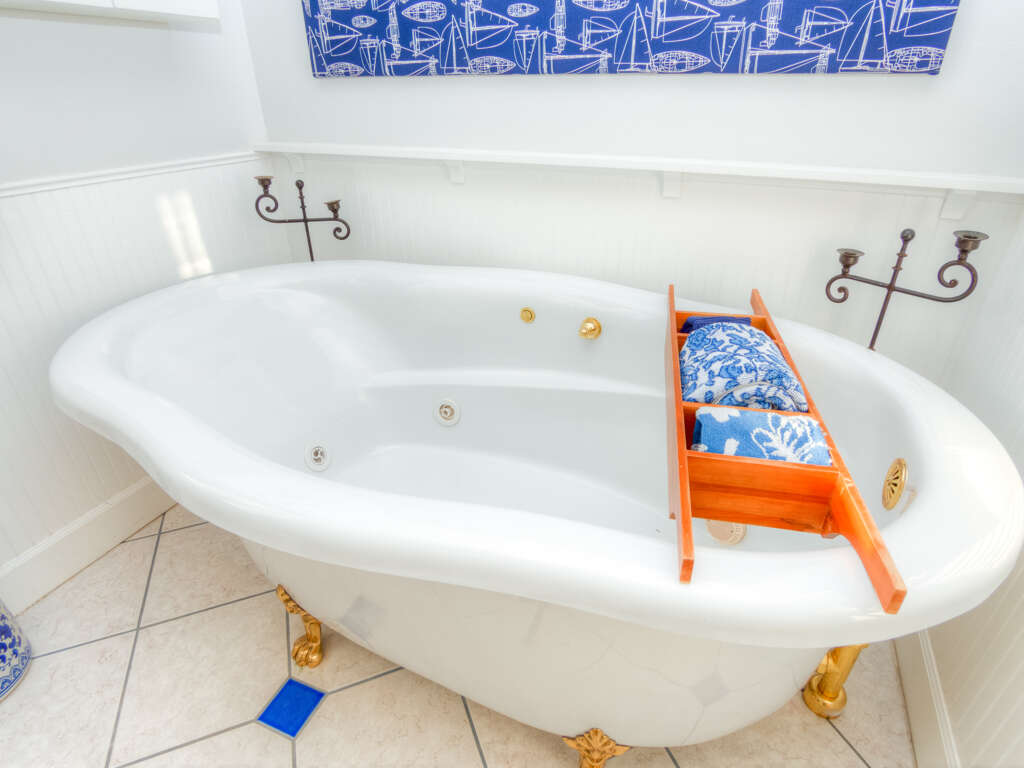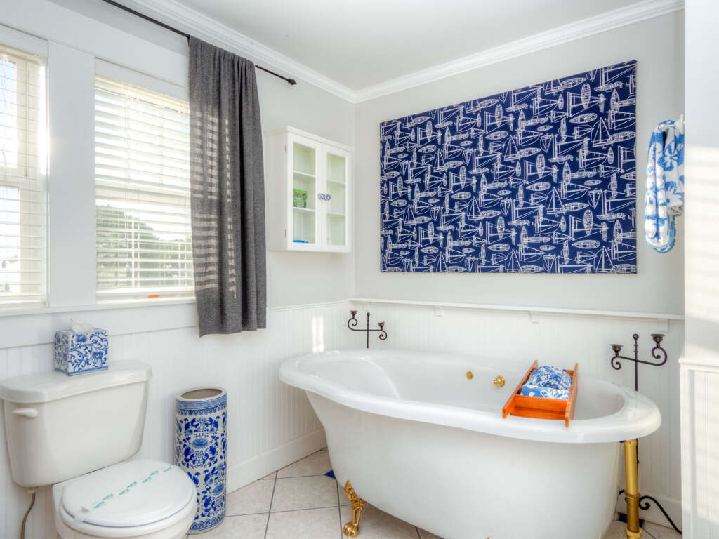Upstairs, you’ll find three inviting bedrooms: one with a double bed, one with a queen, and one with two queens, plus a full bath with a shower and separate tub. For extra guests, a rollaway twin bed is available.