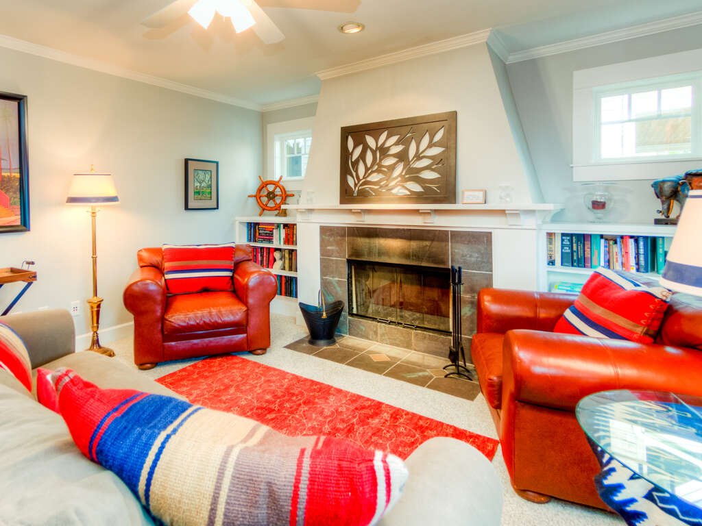 The main level features a serene master suite with a queen bed, private bath with walk-in shower, and a cozy sitting room with a fireplace. Gather in the bright, fully equipped kitchen with a large dining table, or unwind in the living room with a Smart TV. A convenient half bath completes the main floor.