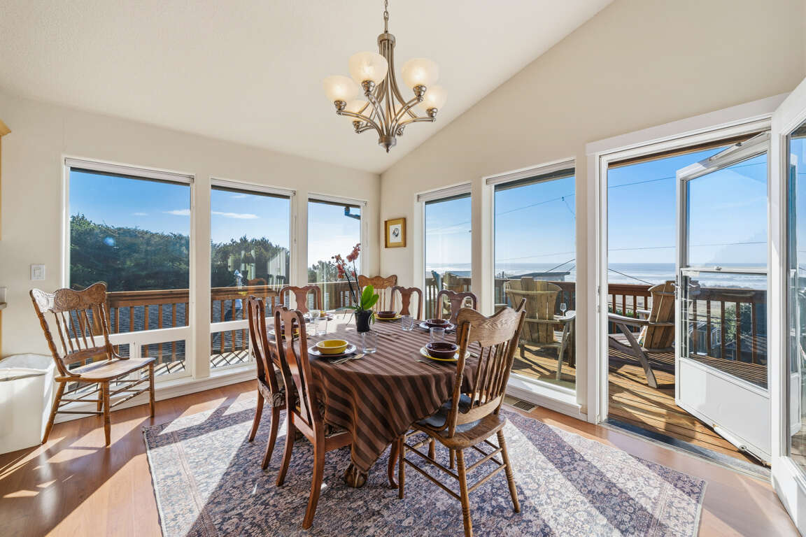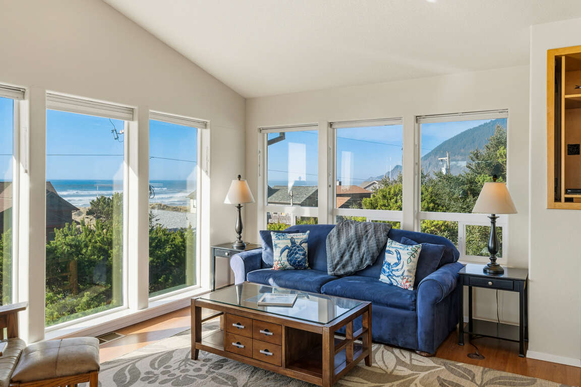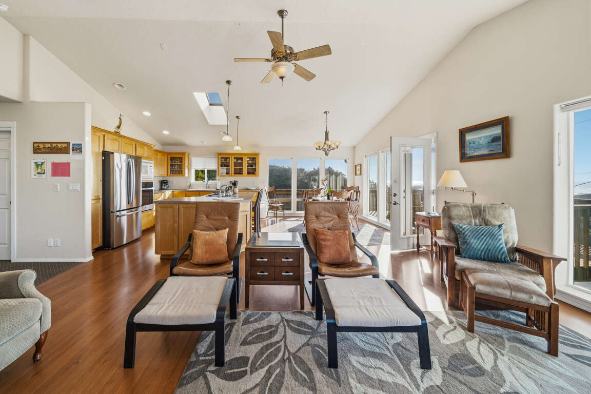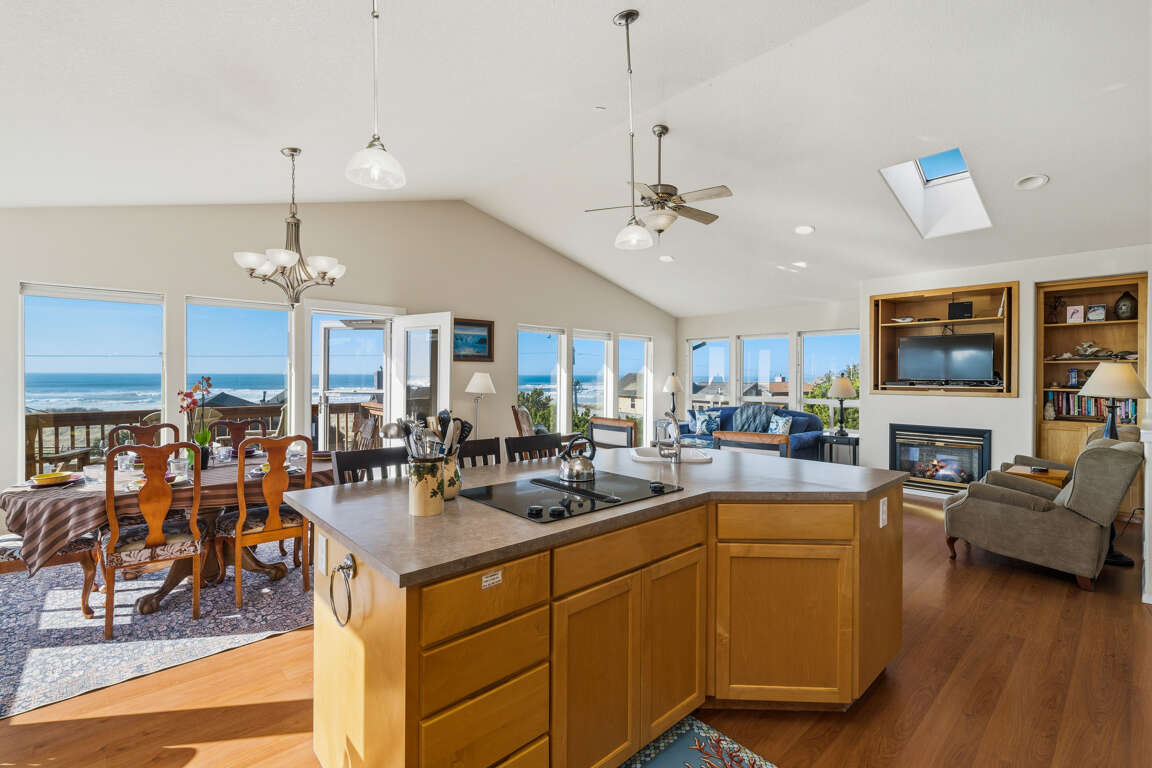 Inside Manzanita Magic, the open-concept living space is designed for gathering and soaking in the views. The living room features large windows showcasing the ocean, a cozy gas fireplace, streaming TV, Wifi and a sleeper sofa for additional guests. The fully equipped kitchen and dining area make preparing meals and sharing memories effortless after a day spent exploring the shoreline.