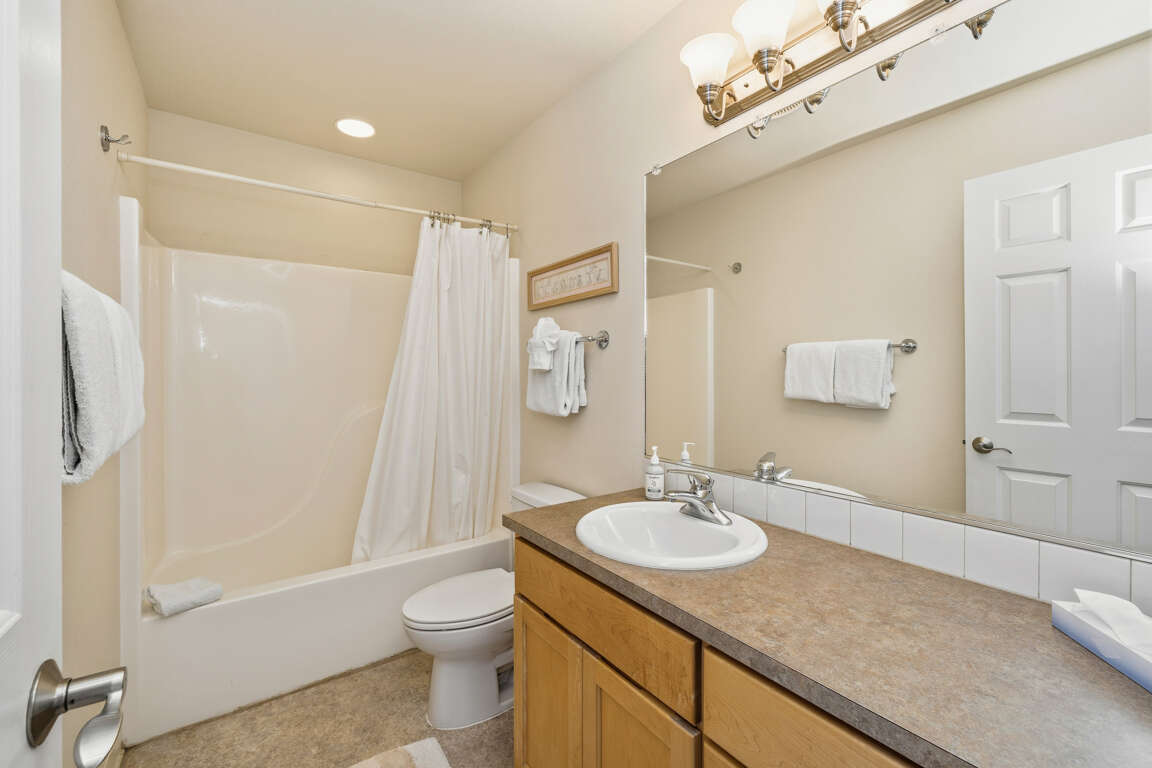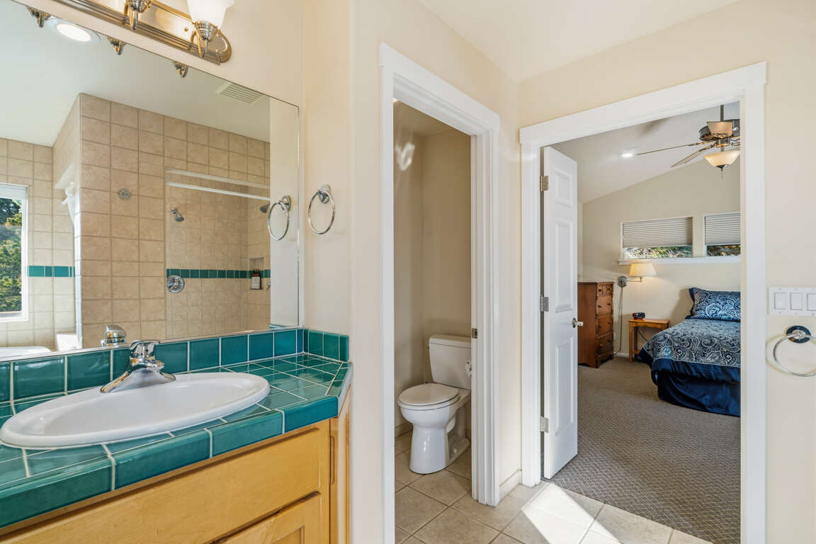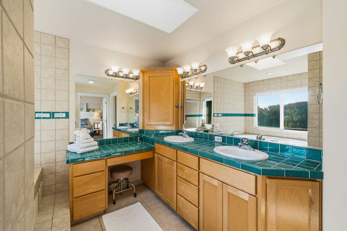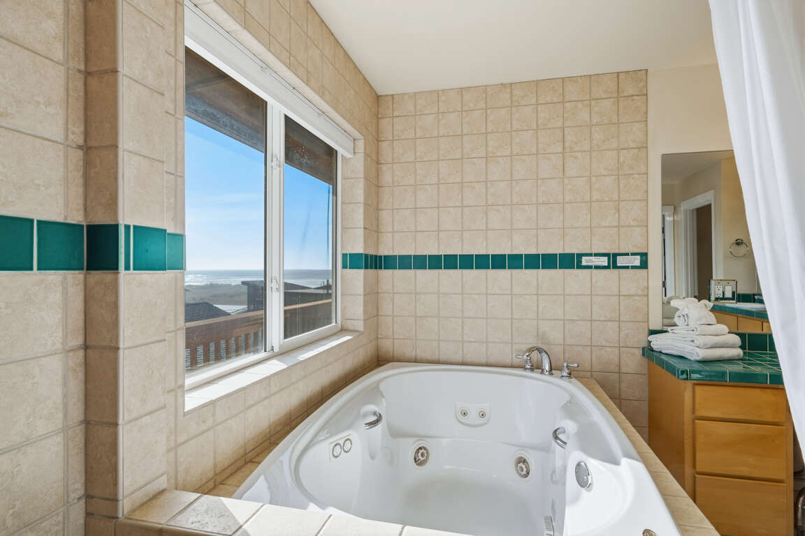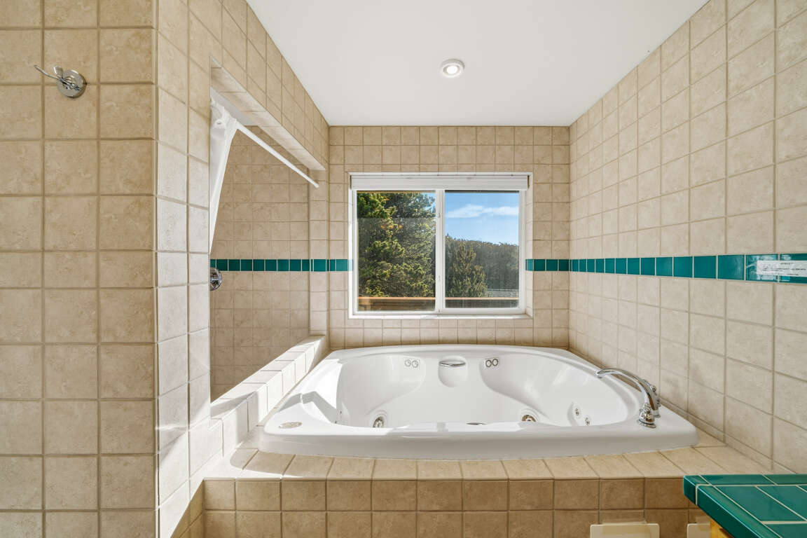 The thoughtfully designed sleeping arrangements provide flexibility for families and groups. The primary suite offers a plush king bed, private deck access, and an attached bathroom complete with a walk-in shower and luxurious jacuzzi tub — perfect for unwinding after a day of coastal adventures. The family suite includes a king bedroom connected to a queen bedroom (please note access to the queen bedroom is through the king room), making it an ideal setup for families. The queen bedroom also offers direct access to the back deck.