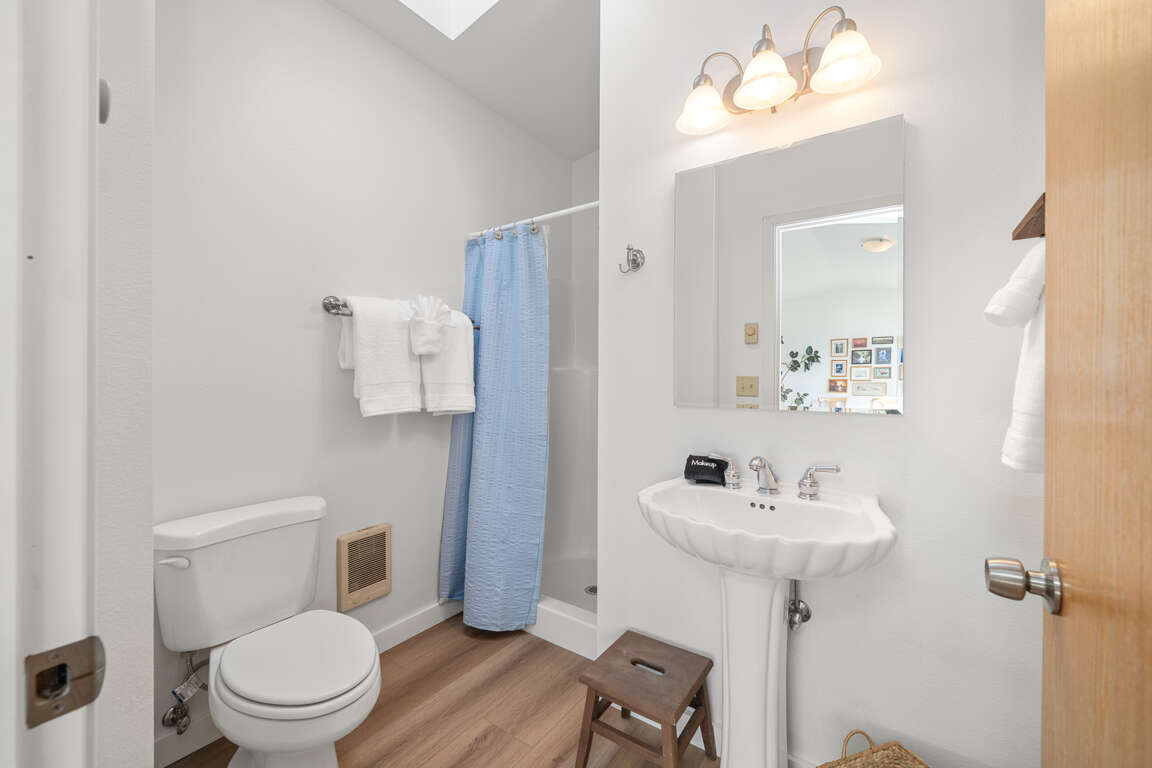 The main living level features a bright, open living area along with two bedrooms, including one with a private bath. Upstairs, you’ll find a comfortable family room, a king bedroom, and a full bathroom, offering extra space to spread out and unwind. The family room is a great place to relax after a day at the beach and includes streaming TV, a DVD player, a video library, and books for cozy evenings in.