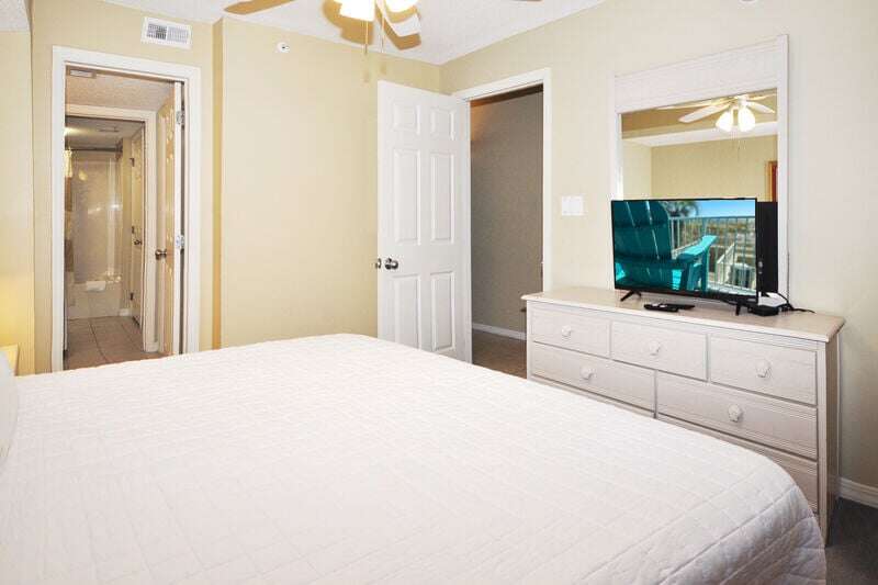 Beach Service Chairs and Umbrella / Beach View from Private Balcony / King Master Bed with Private Bath / Hallway Bunk Beds / Sleeper Sofa / Sleeps 6 / Private Washer Dryer / Uncovered Parking<br />