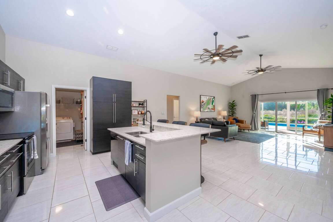 Swiss 49 is a beautiful 3 bed, 2 bath fresh and modern private pool home that was fully renovated in 2024. The home features a split floor plan with a large private master suite on one side and the other two guest bedrooms and bathroom on the opposite side of the home. The back of the home faces West making for beautiful sunset viewing! The living is large with vaulted ceilings and an open floor plan. There is no carpet in the home- only tiled floors, luxury vinyl plank flooring and washable rugs. The laundry is located inside with a full size washer and dryer. Outdoor enjoyment is a breeze with a large screened in patio featuring a dining table for 6 and a conversational seating space looking out over the massive fully fenced private yard and pool area. OPTIONAL***A grill is available as well as pool heating for an additional fee. All furniture and furnishings including bedding and kitchenware are new in 2024, including leather living room furniture. TV's are located in the living room and all bedrooms. The soaring ceilings and large windows throughout the home allow for an abundance of natural light. The kitchen is appointed with a large storage pantry, quartz countertops and bar seating. The home also features an office space, large dining area with seating for 6, a pass-thru gate from the long driveway into the backyard, and sliding glass doors with access to the screened patio from the living room, master bedroom and guest bedroom #1. A prime location lends itself to easy access to all that Clermont and Central Florida have to offer. Clermont's charming downtown dining, shopping and weekend Farmer's Market is a quick 10 minute drive away. Clermont is the ideal destination for athletes and it home to the National Training Center. South Lake County has received designations as a Runner Friendly Community by the Road Runners Club of America and as a Bicycle Friendly Community by the League of American Bicyclists. Downtown Clermont's Waterfront Park provides regular festivals, a splash park, athletic events and a 30 mile fitness trail friendly to walkers, runners and cyclists alike. Water Skiers and golfers are within a stone's throw from the world class Swiss Waterski School and 9 hole golf course. Countless other golf opportunities are located nearby, as well as the Clermont chain of Lakes to satisfy fisherman and all water enthusiasts! Both Florida's East and West coast beaches and all the fun Florida's many amusement parks provide are within a 45min-2 hour drive depending on destination. Winter Garden, Mt. Dora, the manatees of Crystal River and all of Orlando's world class attractions provide additional enjoyment during your Central Florida vacation. Clermont is a beautiful area full of natural wonders and rolling hills. We look forward to welcoming you to our little piece of paradise! We offer special monthly rates. For more details and personalized offers, please reach out to us directly. Our team is ready to assist you! HIGHLIGHTS Attention! The main complex gate code entrance for the community is #1522