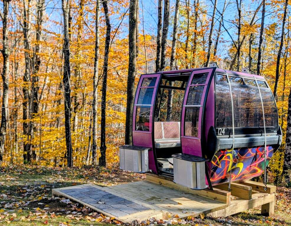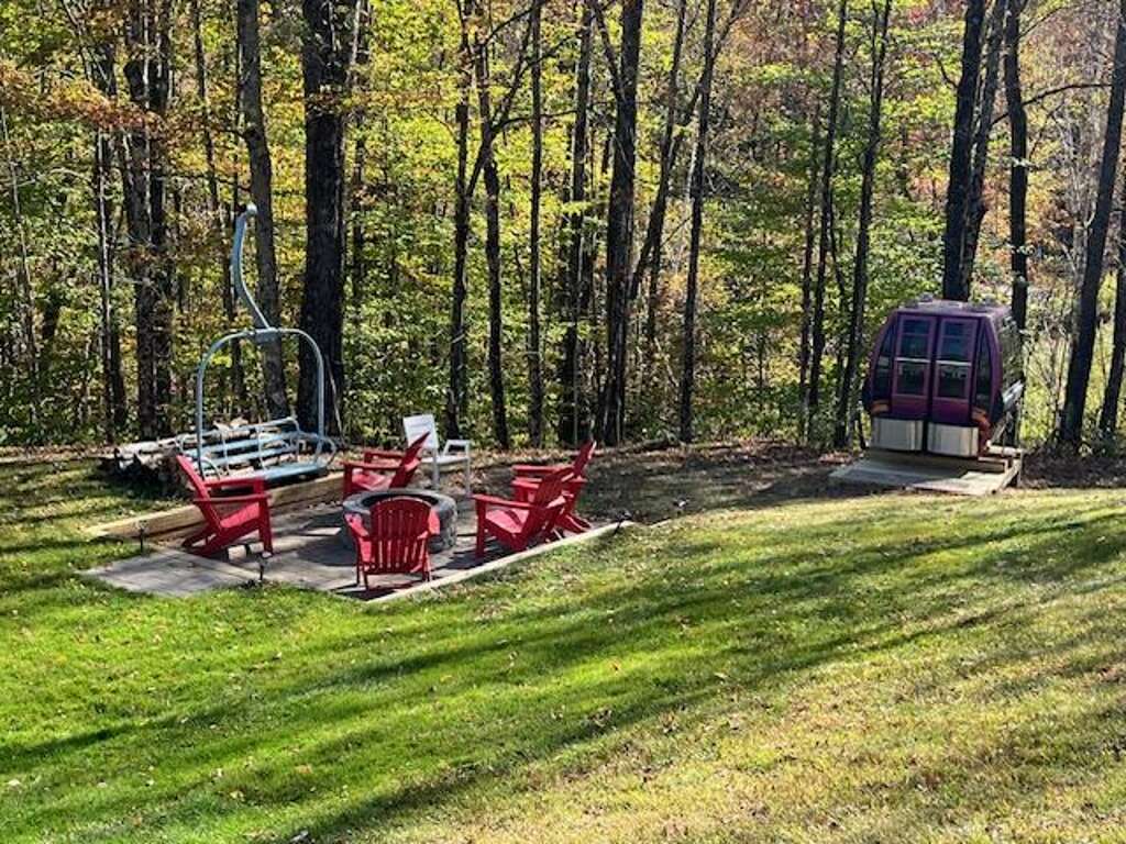 A house with a newly-installed historic Killington Skyeship gondola next to the fire pit, open for you to sit inside and enjoy a quiet drink with a friend or two, or a private chat with up to seven of your closest friends!