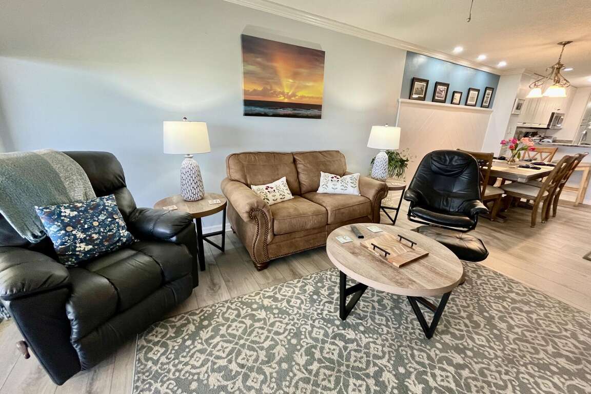 Discover the refined comfort and modern amenities awaiting you in the accommodation at Beachfront Paradise on 307 Premiere Vista Way. The master bedroom features a luxurious king bed, TV, and stunning oceanfront views, while the guest bedroom offers two cozy twin beds with a TV. Both bathrooms have been recently updated, featuring a walk-in shower in the master bath and a tub/shower combo in the guest bath. The living room boasts a flat-screen TV and comfortable seating, perfect for relaxing after a day at the beach. Enjoy meals in the dining area with seating for four, all while soaking in the beachfront luxury. This family-friendly environment offers a perfect blend of comfort and convenience for your vacation needs.