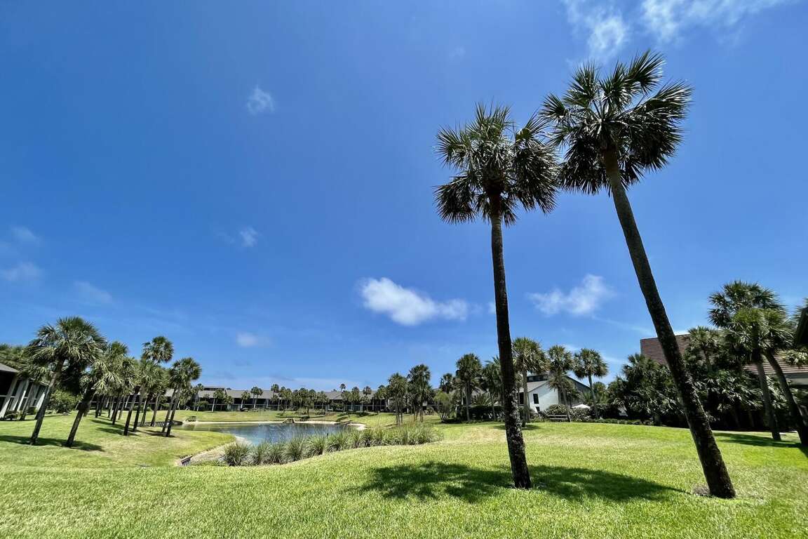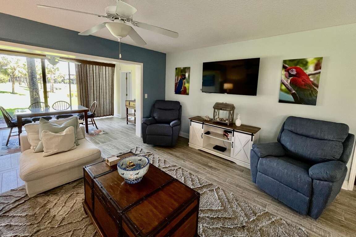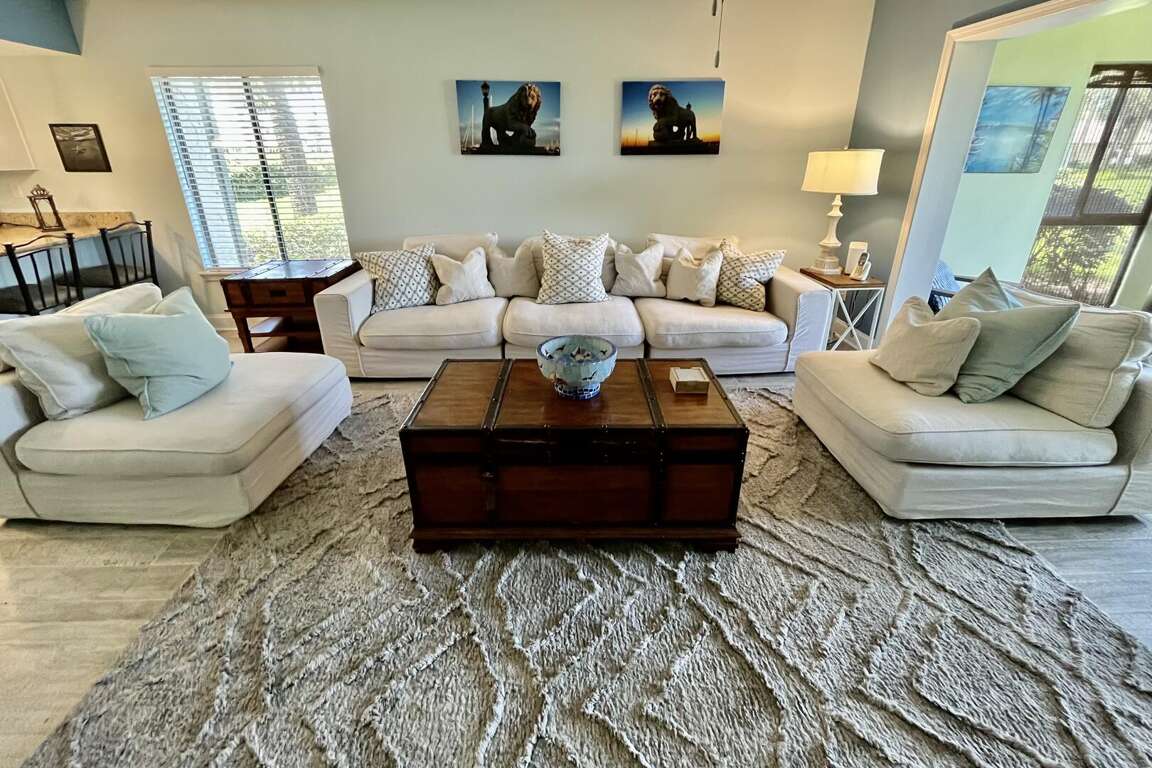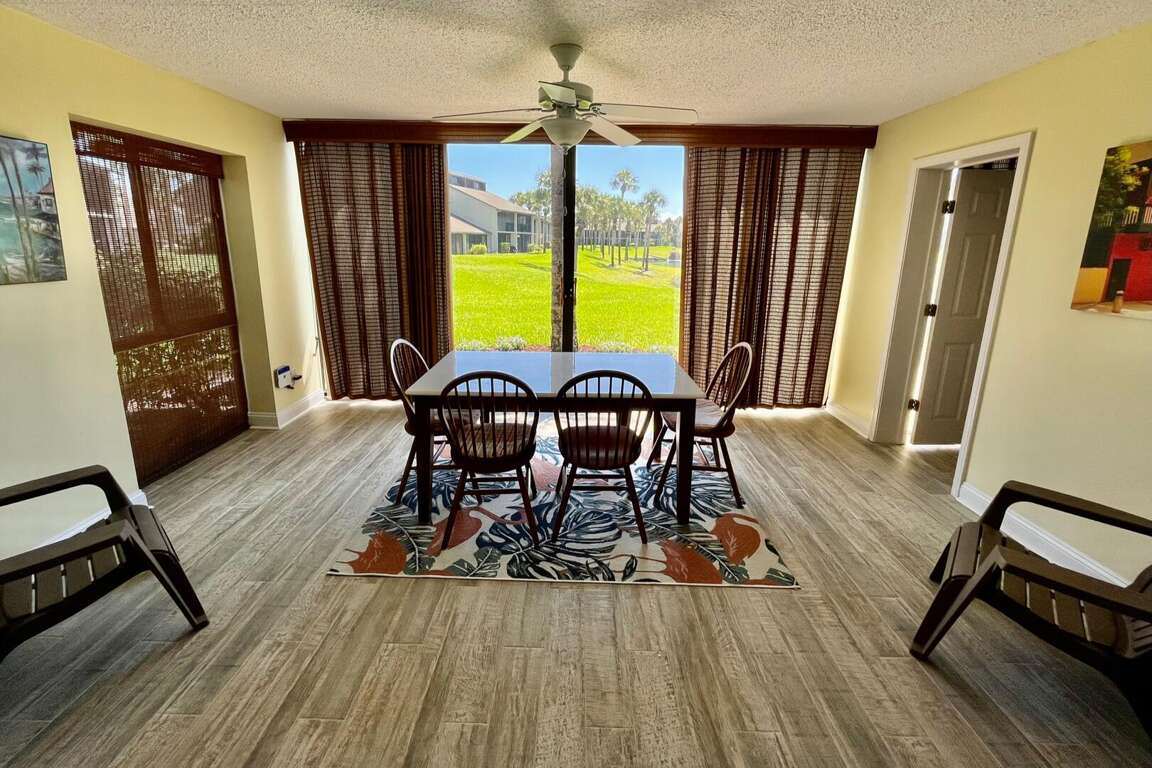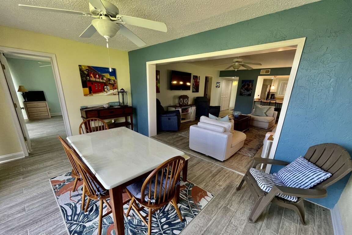 The condo's enclosed lanai has been creatively transformed into a dining area, offering a picturesque setting for meals with a view of the lagoon and surrounding grounds. With a newly renovated kitchen boasting granite countertops and new cabinets, the space exudes modern elegance. The living room features a comfortable sectional sofa and a flat-screen TV, perfect for relaxing after a day of exploring St. Augustine Beach. Guests can enjoy scenic views of the lagoon and grounds, creating a tranquil atmosphere for unwinding. This condo comfortably accommodates up to 6 guests, making it ideal for families or groups looking for a peaceful retreat with convenient access to the beach and amenities.