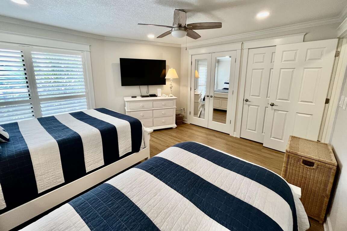 Bed and mattresses were very nice. Entire unit was great. Lots of closets and storage. Items for pool and beach were wonderful. Thanks for that.