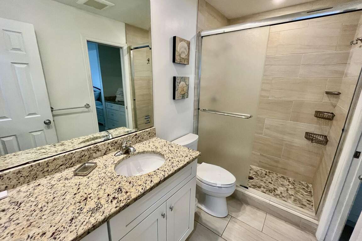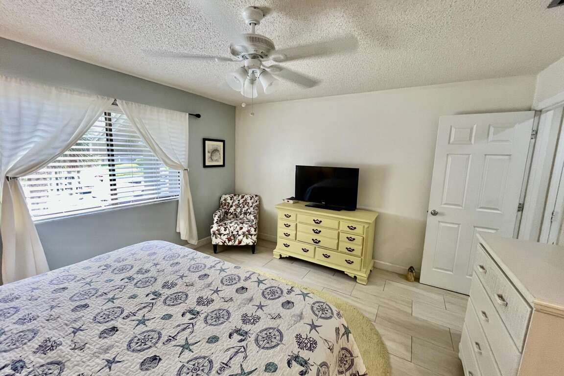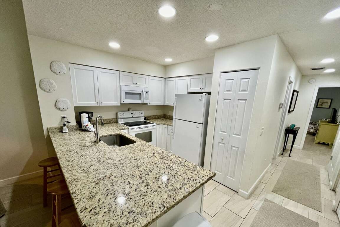 What essential amenities and features does the 16 Village Las Palmas Circle G Condo in St. Augustine Beach, FL offer for a comfortable stay? The accommodation features a cozy 1-bedroom layout with a king bed in the master bedroom, along with 2 sleeper sofas in the living area accommodating up to 4 guests. Room amenities include a flat-screen TV in the master bedroom and living area for entertainment. The condo boasts a newly renovated kitchen for convenient meal preparation, a renovated bathroom with a walk-in shower for relaxation, and a comfortably furnished living area. Additionally, guests have access to the Village Las Palmas pool for leisurely swims. These amenities provide a relaxing and enjoyable stay for those seeking comfort and convenience during their visit.
