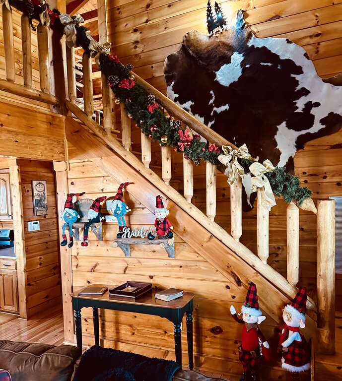 Moving to the upper level of Hickory Hill luxury cabin in Sevierville, TN reveals a charming and well-appointed space designed for comfort and enjoyment. This level features: - Bedroom with a full bed for a cozy night's rest - Bunk room with twin-over-twin and twin-over-full bunk beds, perfect for kids or extra guests - Large HDTV in the main bedroom for entertainment - Full bathroom with tub/shower facilities for convenience - Thoughtfully designed spaces that cater to relaxation and leisure.