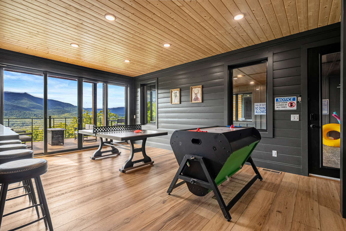 Spectacular Views, Indoor Pool, Theater, Game Room, Hot Tub, Wi-Fi, Outdoor Fireplace, Resort Pools & Golf Course, Signature Series. This is strictly a NON-pet friendly cabin. No Parties Allowed. Maximum Occupancy 12 Guests ONLY. No Exceptions. Welcome to Gatlinburg Country High Life! Located in Gatlinburg is this 3,600 sqft, beautiful modern-country-chic home with 3 bedrooms, 3 full bathrooms and 2 half baths. This 3-story spacious cabin offers every luxury and caters to the discerning traveler seeking a unique and luxurious vacation experience in The Great Smoky Mountains. The cabin features a year-round heated indoor pool, spectacular mountain views, game room, theater room, spacious decks with outdoor fireplace, hot tub, wifi and is perfect for a small family, or couples retreat. With generous parking for up to 5 vehicles and easy access into the home (NO STEPS), you enter this home, awe-struck by the amazing detail and finishes as you make your way through the interior. There is Wi-Fi and streaming service throughout the cabin. Guest have access to the Cobbly Nob Resort facilities, including seasonal pools, picket ball, basketball court as well as the golf course. The Seasonal Pool will be available only between Memorial Day and Labor Day. Main Level: The main level features the living room, kitchen, dining room, 1 bedroom with ensuite bath, laundry room, half bath and access to the deck. The fully equipped, open concept gourmet kitchen features stainless appliances, granite countertops and bar-seating for 5 guests. Just off the kitchen you will find the laundry room with washer & dryer and a half bath. The dining table provides seating for 8 and overlooks the great room with it's impressive 2-story electric fireplace, comfortable furniture, large Smart HDTV and a gorgeous wall of windows. Sitting in the cozy great room, you can enjoy the spectacular mountain views as far as the eye can see. The bedroom on this level features a king bed, large HDTV, an ensuite full bath with tiled shower and access to the deck. Walking out onto the covered deck, you have bar seating and an outdoor dining table with chairs. To the right, you will find a private sitting area with a wood-burning fireplace a large Smart HDTV and incredible views! The charcoal grill is located just off the front porch. Upper Level: The upper level features 2 bedrooms with ensuite bathrooms and access to the deck. The master bedroom features a king bed, Smart HDTV, a private bathroom with walk-in tiled shower and a soaker tub and access to the back deck. The second bedroom features 2 queen-over-queen bunks, HDTV and a full bathroom with tiled shower. Lower Level: The lower level features the game room, theater room, indoor pool and access to the deck with hot tub. The game room offers a variety of games, including 3 arcade games, table tennis, a combo foosball/air hockey/pool game, a mini-bar with fridge and microwave and bar seating. The theater room offers comfortable seating and a large HDTV with surround sound. The covered deck offers a row of bar-seating, an outdoor lounge area with gas fire pit, a private enclave with a large hot tub and views from every angle. Guests are provided with a complimentary Luxury Pass, offering a free ticket daily to several of the area’s most popular attractions. See under AREA INFO for more details, rules, & restrictions. Be sure to explore other nearby attractions including Ober Gatlinburg, The Arts & Crafts Community in Gatlinburg, Anakeesta Gatlinburg, Dollywood, Splash Country, and The Island! Gatlinburg Country High Life is perfect for guests who appreciate the finer tastes in life. This is where you are going to make memories that will last you a life-time.