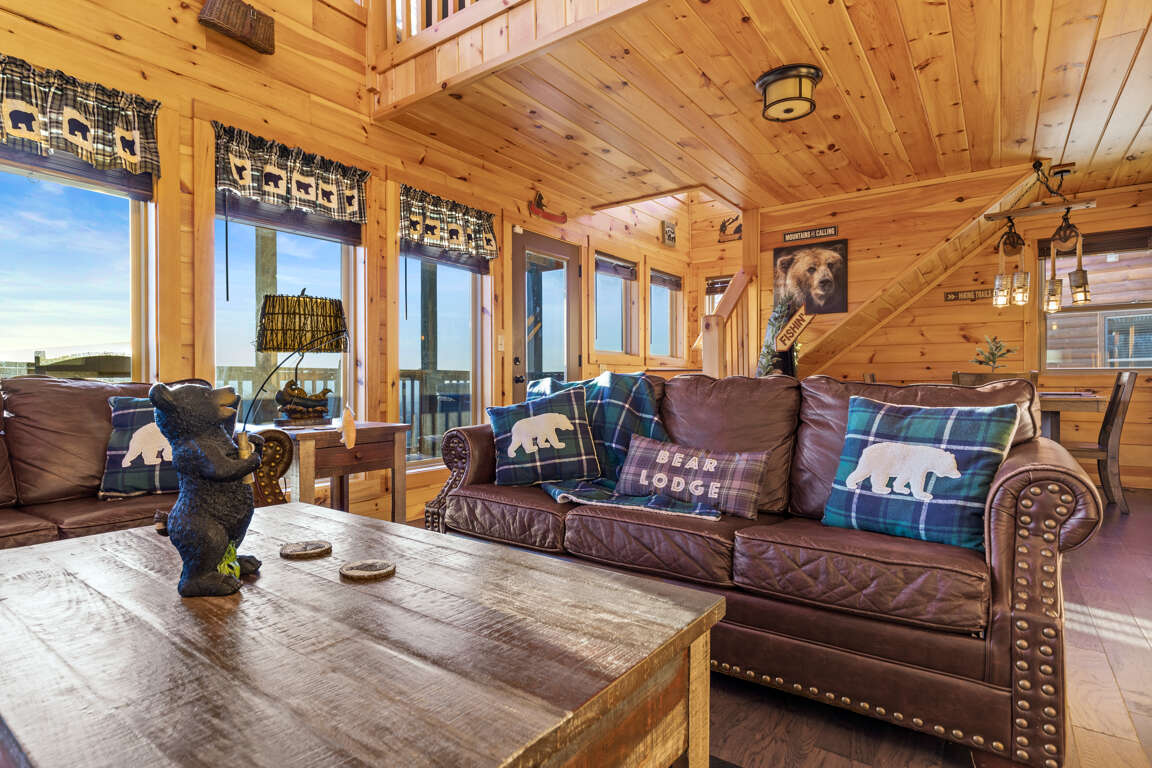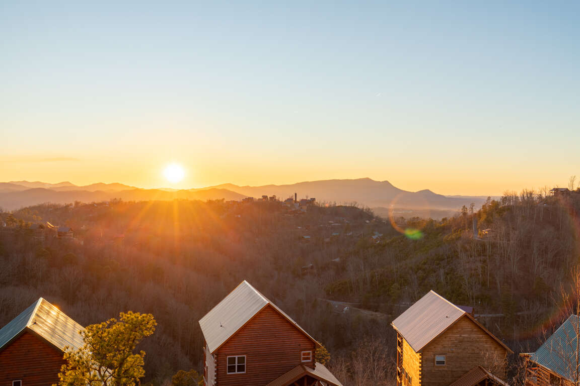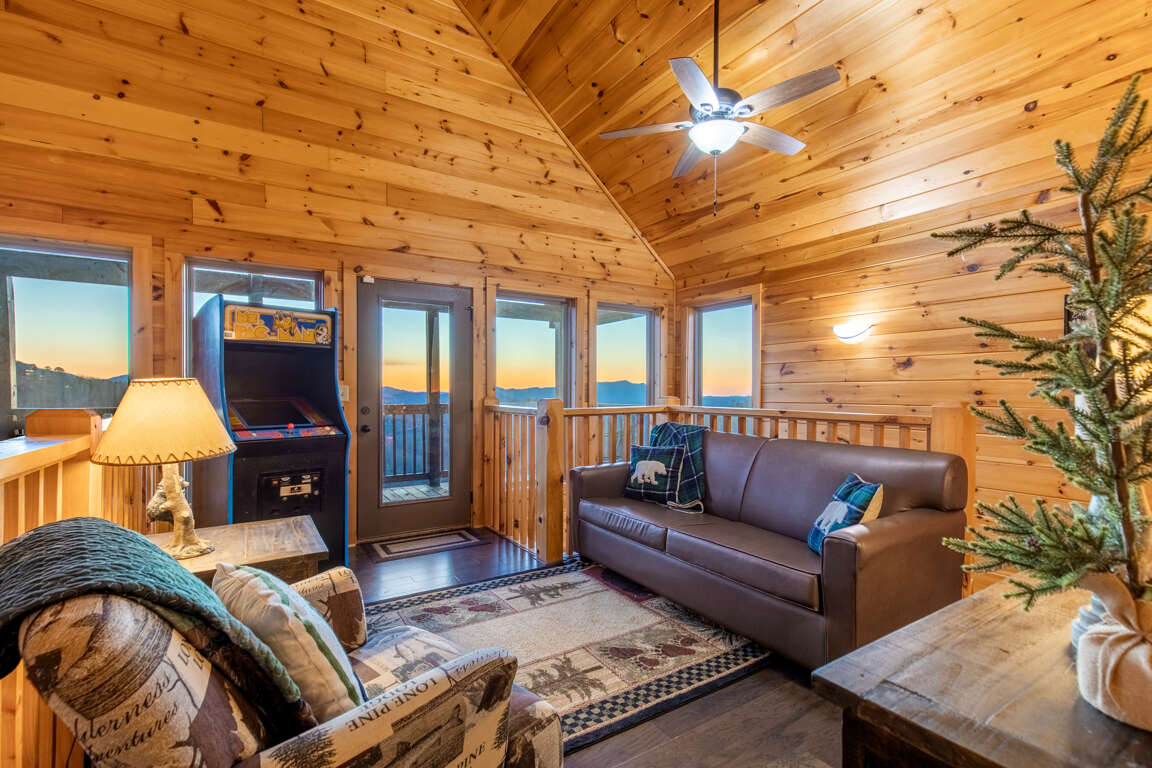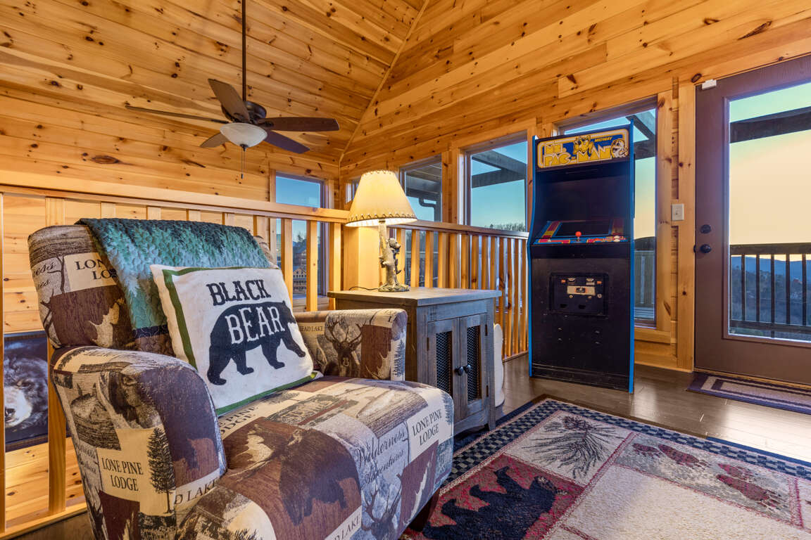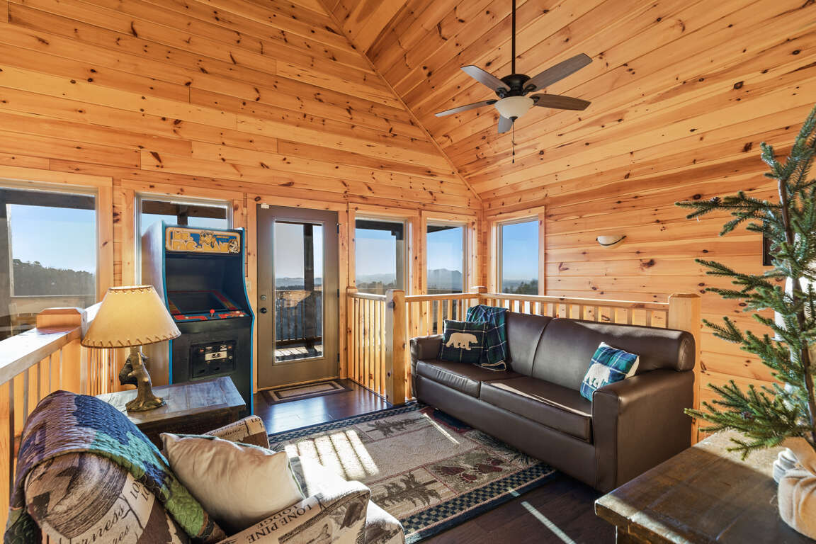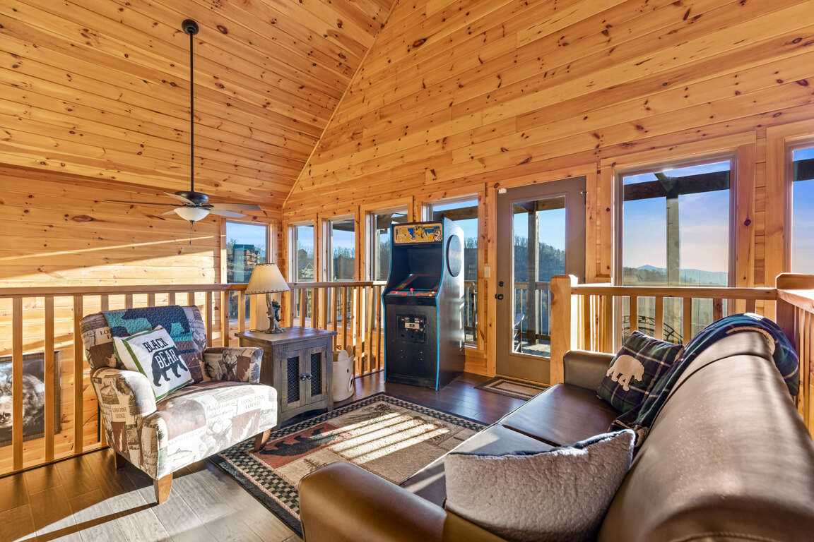 Spectacular Mountain View, Honeymoon, Games, Hot Tub, Wifi, Resort Pool, near Dollywood and other Attractions! Welcome to Above The Smokies! This 2-story, 1,200 square feet, beautiful log cabin with 2 bedrooms and 2 bathrooms sleeps 8 guests and offers every luxury and caters to the discerning traveler seeking a unique and luxurious vacation experience in The Great Smoky Mountains. The cabin offers spectacular mountain views, a game room, hot tub, wifi throughout the cabin and is perfect for a small family or a couples retreat. There is parking for 3 vehicles and easy access into the cabin. Guests have access to the seasonal resort pool. Main Level: The main level features the living room, kitchen, dining, 1 bedroom with full bath, laundry and access to the spacious deck with hot tub. The living room offers comfortable seating (including a sofa sleeper), a stacked-stone gas fireplace, a large HDTV and access to the deck. The kitchen is fully equipped and the dining table seats 4 to 6 people. The bedroom on this level features a king bed, large HDTV and a full bathroom with tub/shower. Step out onto the covered deck and enjoy the sounds of nature from the rocking chairs or relax in the soothing hot tub after a long day out. The charcoal grill is located just off the front porch. Upper Level: Travel upstairs to find the loft area with game room/lounge, 1 bedroom, full bath and access to the covered deck with beautiful mountain views. The game room/lounge area offers an arcade game and a sitting area with sleeper sofa. The enclosed bedroom offers a king bed, HDTV and an adjoining full bath with jetted tub and walk-in shower. Step out onto the deck and relax in one of the rockers while enjoying the expansive view over the mountains. During the Summer Months, take a stroll down to the nearby resort pool. Relax in the sun, or enjoy a picnic and cook-out under the trees. There is also parking available at the pool. Guests are provided with a complimentary Luxury Pass, offering a free ticket daily to several of the area’s most popular attractions. See under AREA INFO for more details, rules, & restrictions. Be sure to explore other nearby attractions including Ober Gatlinburg, The Arts & Crafts Community in Gatlinburg, Anakeesta Gatlinburg, Dollywood, Splash Country, and The Island! Above The Smokies is perfect for guests who appreciate the finer tastes in life. This is where you are going to make memories that will last you a life-time.