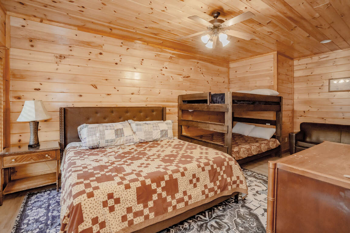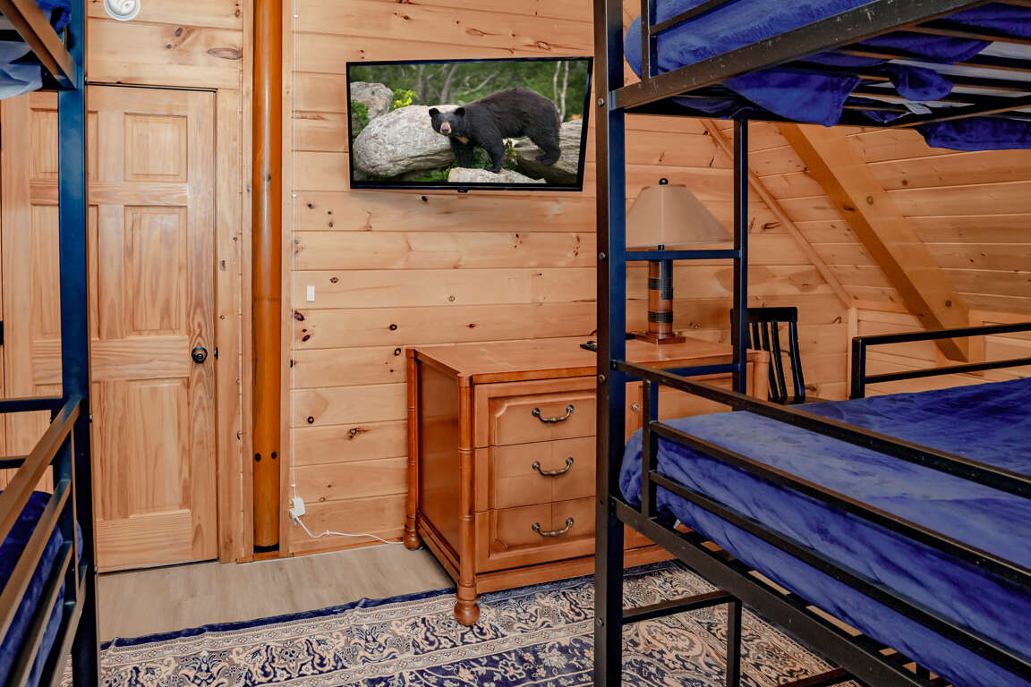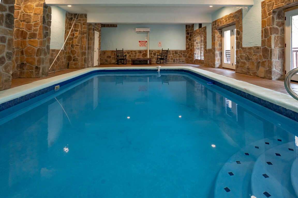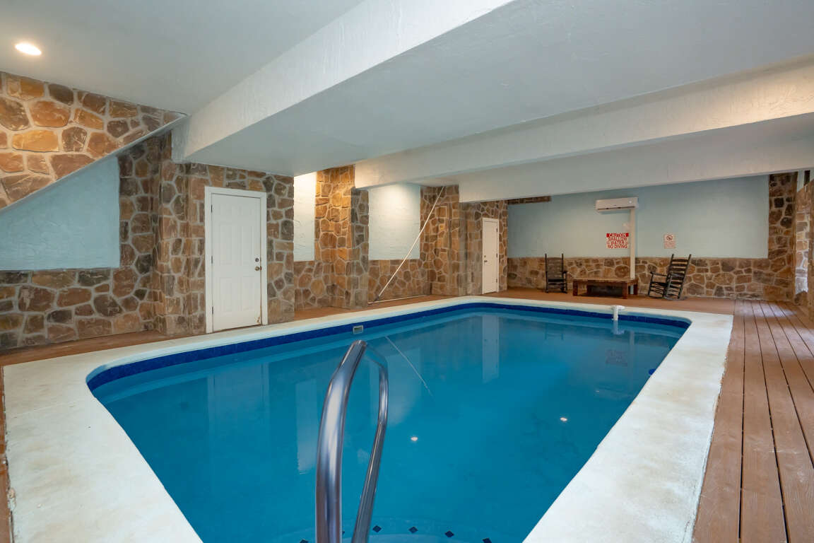 INDOOR POOL, Pet-Friendly, Wooded View, Theater, Game Room, Hot Tub, Wi-Fi, near Attractions! Welcome to Storybrooke Lodge (f.k.a. Swimming Bear Lodge)! Nestled in Black Bear Ridge and just minutes from Pigeon Forge Parkway, this stunning 5-level cabin offers over 6,000 sqft of living space and sleeps 48. With 8 bedrooms, 6.5 bathrooms, a game room, home theater, private heated indoor pool, hot tub, Wi-Fi throughout, parking for 8 vehicles, and serene wooded views, it’s perfect for large groups and families. Plus, it’s pet-friendly, so bring your furry friends along! Main Level: Step inside to find the spacious living room, fully equipped kitchen, dining area, and two king bedrooms with full baths. Comfortable seating and a electric fireplace set the tone in the living room, accompanied by a large HDTV for entertainment. The kitchen boasts stainless steel appliances and counter seating for 12, plus 16 bar counter seating and the dining tables seats 14 guests comfortably. Each of the two bedrooms on this floor offers a king bed, large HDTV, sleeper sofa/couch, and an en-suite full bathroom featuring a step-in shower and jetted tub. Both bedrooms also have access to a private balcony. Just off the front porch, the cook-out area includes a gas grill and two charcoal grills for outdoor dining. Upper Level 1: Ascend to the second level with spacious game area, shared full bath and 2 bedrooms with en-suite baths. The game room is fully equipped with a pool table, three arcade games, foosball, a large fridge, 2 sleeper sofas, and a full bathroom with tub/shower. The 1st bedroom features a king bed, a sleeper sofa, HDTV, private balcony, and an en-suite full bathroom with step-in shower and jetted tub. The 2nd bedroom offers a king bed, HDTV, private balcony, and en-suite bathroom with similar amenities. Upper Level 2: Top Floor/Loft The top floor contains two separate bedroom areas connected by a catwalk. Each bedroom features 2 Triple Queen Bunks, perfect for the kids. Lower Level 1: Downstairs from the main level, find the home theater, laundry area, 2 more bedrooms and a full bath. The theater boasts 16 cinema-style seats and a large HDTV. A laundry closet with washer and dryer adds convenience. The 1st bedroom features a king bed and access to the deck. The 2nd bedroom offers a king bed, queen bunk, sleeper sofa and deck access. These 2 bedrooms share a Jack 'n Jill bathroom with step-in shower. Lower Level 2: Pool Level At the lowest level, enjoy the heated indoor pool, a half bath, and step outside to the deck featuring a soothing hot tub. Guests are provided with a complimentary Luxury Pass, offering a free ticket daily to several of the area’s most popular attractions. See under AREA INFO for more details, rules, & restrictions. Be sure to explore other nearby attractions including Ober Gatlinburg, The Arts & Crafts Community in Gatlinburg, Anakeesta Gatlinburg, Dollywood, Splash Country, and The Island!