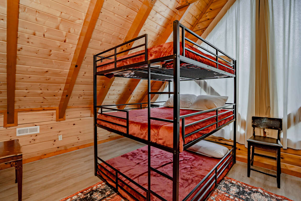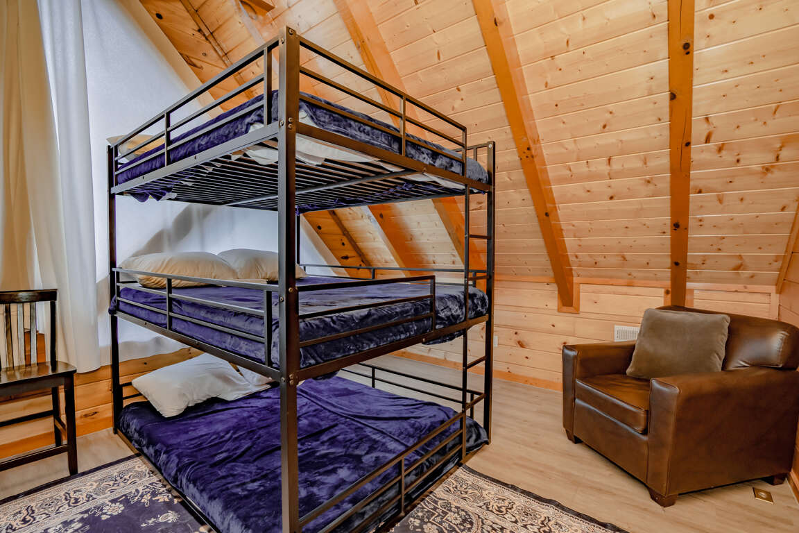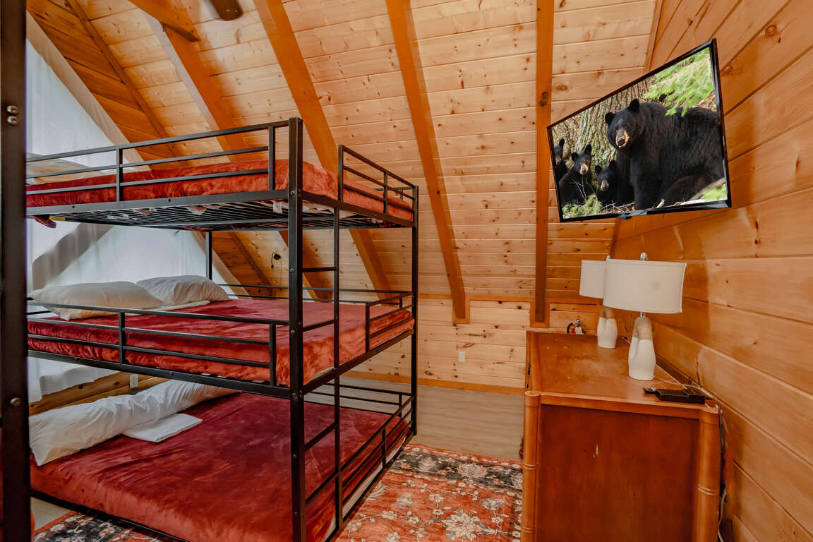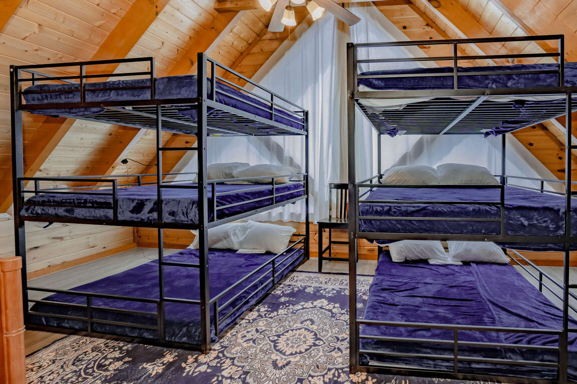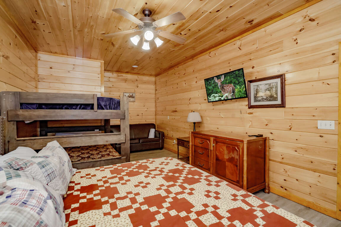 INDOOR POOL, Pet-Friendly, Wooded View, Theater, Game Room, Hot Tub, Wi-Fi, near Attractions! Welcome to Storybrooke Lodge (f.k.a. Swimming Bear Lodge)! Nestled in Black Bear Ridge and just minutes from Pigeon Forge Parkway, this stunning 5-level cabin offers over 6,000 sqft of living space and sleeps 48. With 8 bedrooms, 6.5 bathrooms, a game room, home theater, private heated indoor pool, hot tub, Wi-Fi throughout, parking for 8 vehicles, and serene wooded views, it’s perfect for large groups and families. Plus, it’s pet-friendly, so bring your furry friends along! Main Level: Step inside to find the spacious living room, fully equipped kitchen, dining area, and two king bedrooms with full baths. Comfortable seating and a electric fireplace set the tone in the living room, accompanied by a large HDTV for entertainment. The kitchen boasts stainless steel appliances and counter seating for 12, plus 16 bar counter seating and the dining tables seats 14 guests comfortably. Each of the two bedrooms on this floor offers a king bed, large HDTV, sleeper sofa/couch, and an en-suite full bathroom featuring a step-in shower and jetted tub. Both bedrooms also have access to a private balcony. Just off the front porch, the cook-out area includes a gas grill and two charcoal grills for outdoor dining. Upper Level 1: Ascend to the second level with spacious game area, shared full bath and 2 bedrooms with en-suite baths. The game room is fully equipped with a pool table, three arcade games, foosball, a large fridge, 2 sleeper sofas, and a full bathroom with tub/shower. The 1st bedroom features a king bed, a sleeper sofa, HDTV, private balcony, and an en-suite full bathroom with step-in shower and jetted tub. The 2nd bedroom offers a king bed, HDTV, private balcony, and en-suite bathroom with similar amenities. Upper Level 2: Top Floor/Loft The top floor contains two separate bedroom areas connected by a catwalk. Each bedroom features 2 Triple Queen Bunks, perfect for the kids. Lower Level 1: Downstairs from the main level, find the home theater, laundry area, 2 more bedrooms and a full bath. The theater boasts 16 cinema-style seats and a large HDTV. A laundry closet with washer and dryer adds convenience. The 1st bedroom features a king bed and access to the deck. The 2nd bedroom offers a king bed, queen bunk, sleeper sofa and deck access. These 2 bedrooms share a Jack 'n Jill bathroom with step-in shower. Lower Level 2: Pool Level At the lowest level, enjoy the heated indoor pool, a half bath, and step outside to the deck featuring a soothing hot tub. Guests are provided with a complimentary Luxury Pass, offering a free ticket daily to several of the area’s most popular attractions. See under AREA INFO for more details, rules, & restrictions. Be sure to explore other nearby attractions including Ober Gatlinburg, The Arts & Crafts Community in Gatlinburg, Anakeesta Gatlinburg, Dollywood, Splash Country, and The Island!