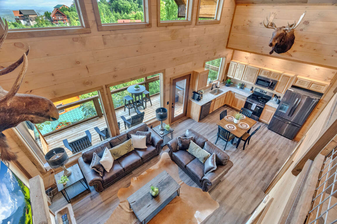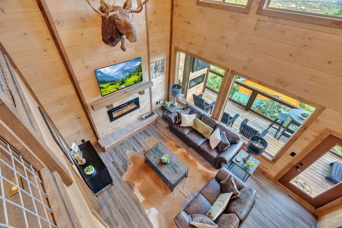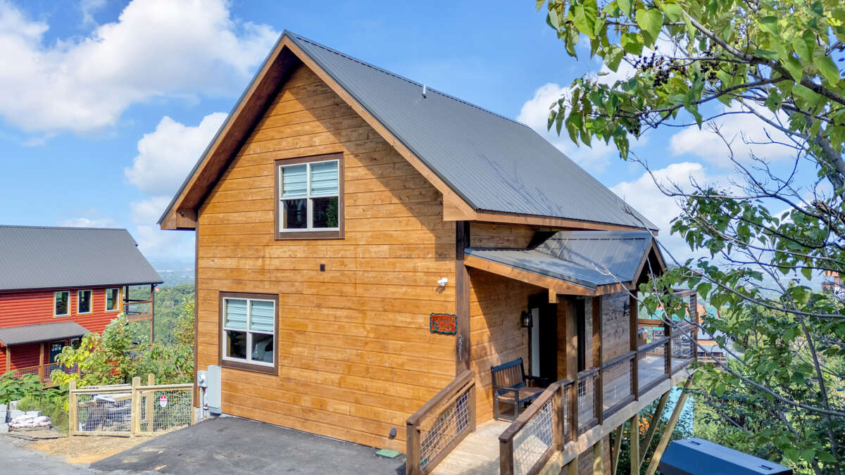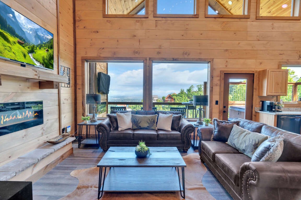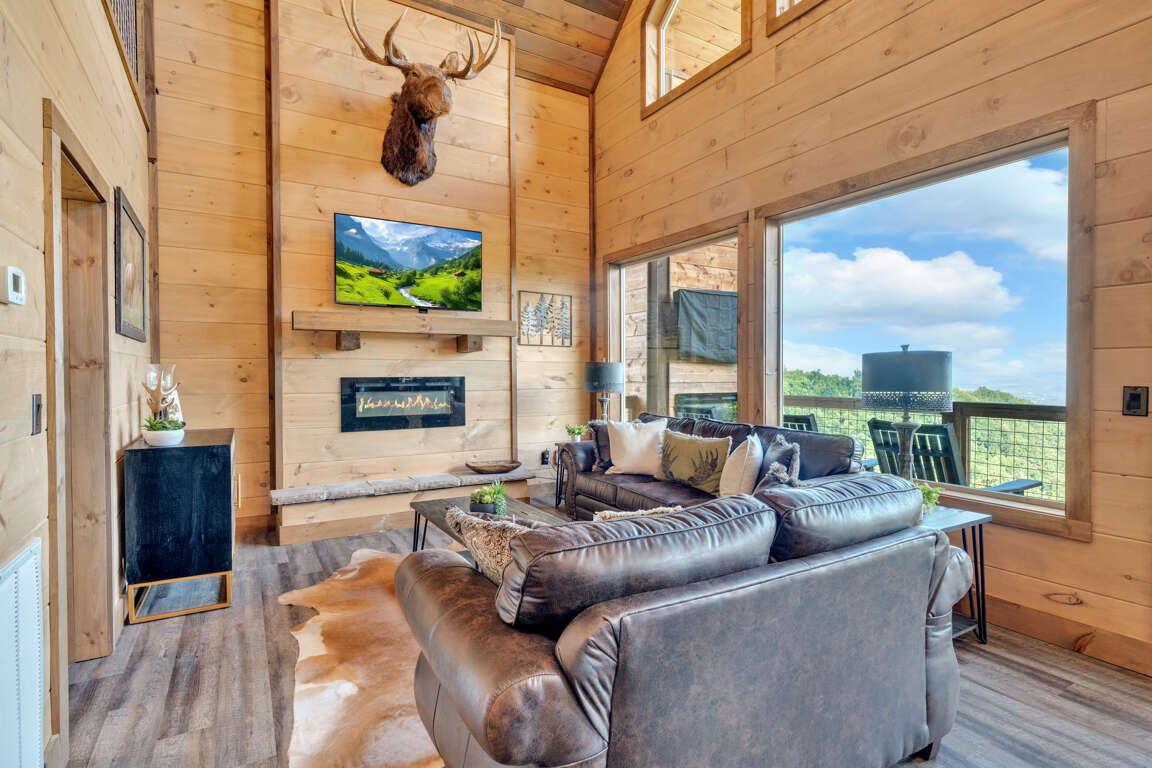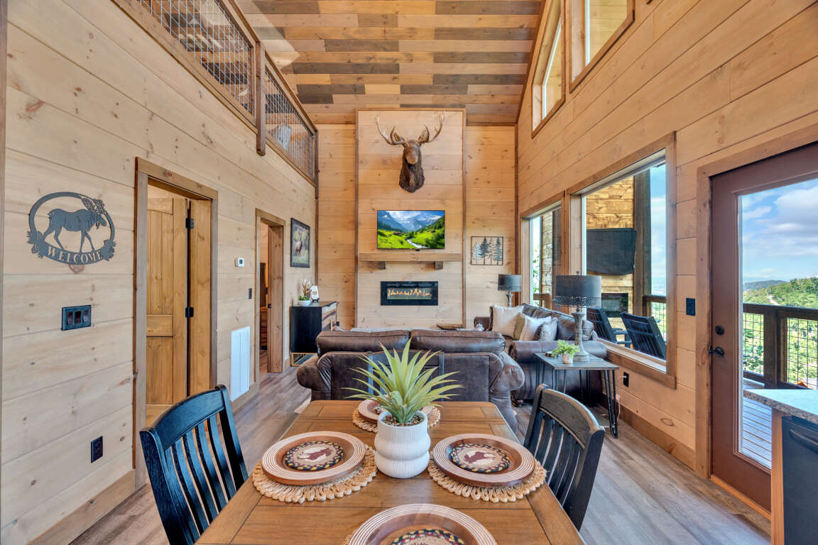Spectacular Views, Hot Tub, Wifi, Outdoor Fireplace, Resort Pool Moose Top is a newly built, 2-story, luxurious 2 bedroom, 1.5 bathroom cabin with panoramic views of the Smokies. This cozy yet elegant retreat spans approximately 1,000 sq ft and is perfectly suited for couples or solo travelers seeking a peaceful mountain escape. The cabin is located near Dollywood and offers spectacular views, hot tub, Wifi, an outdoor fireplace, parking for 2 vehicles and access to the seasonal Resort Pool. Main Level: The main level of this cabin features the Kitchen, Living Room, 1 Bedroom, 1 Full Bathroom, the laundry closet and access to the deck. The Kitchen is fully equipped and offers granite counters and stainless steel appliances as well as a table to seat 4. The Living Room features 2 couches, an electric fireplace, HDTV and deck access. The Bedroom on this level offers a King bed, HDTV and access to the full bathroom. The Bathroom features a double vanity and step-in tiled shower. A charcoal grill is located just off the front porch for your convenience. Step out onto the deck where you will find a cozy fireplace, an outdoor HDTV, hot tub, seating and views for days! Upper Level: The upper level of this cabin features a loft bedroom with a Twin-over-Queen bunk bed, a half bathroom, HDTV and breathtaking views through the large windows. The seasonal Resort Pool is available between mid-May and mid-September. Guests are provided with a complimentary Luxury Pass, offering a free ticket daily to several of the area’s most popular attractions. See under AREA INFO for more details, rules, & restrictions. Be sure to explore other nearby attractions including Ober Gatlinburg, The Arts & Crafts Community in Gatlinburg, Anakeesta Gatlinburg, Dollywood, Splash Country, and The Island!