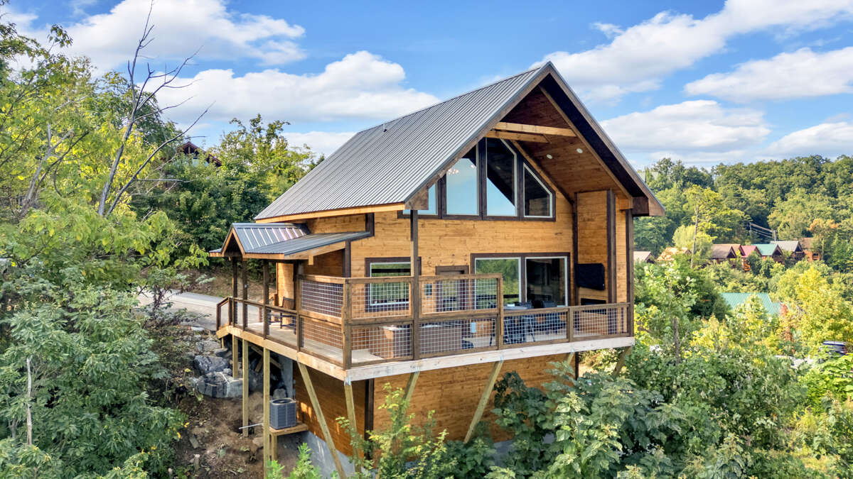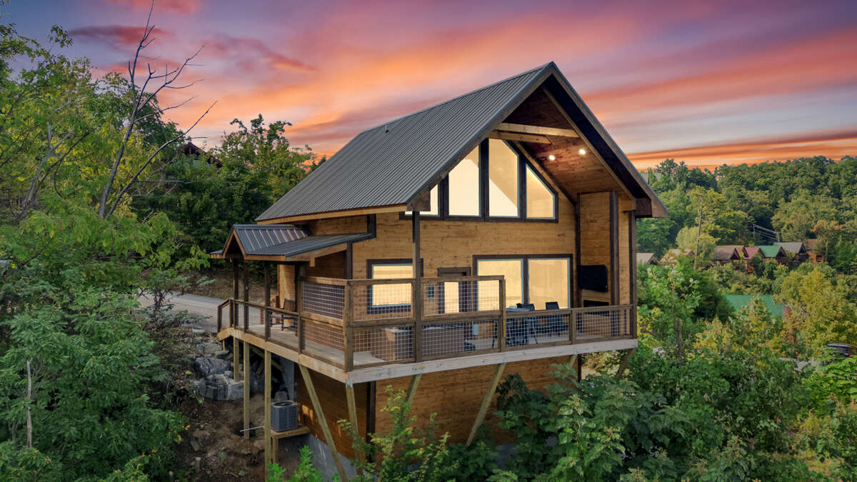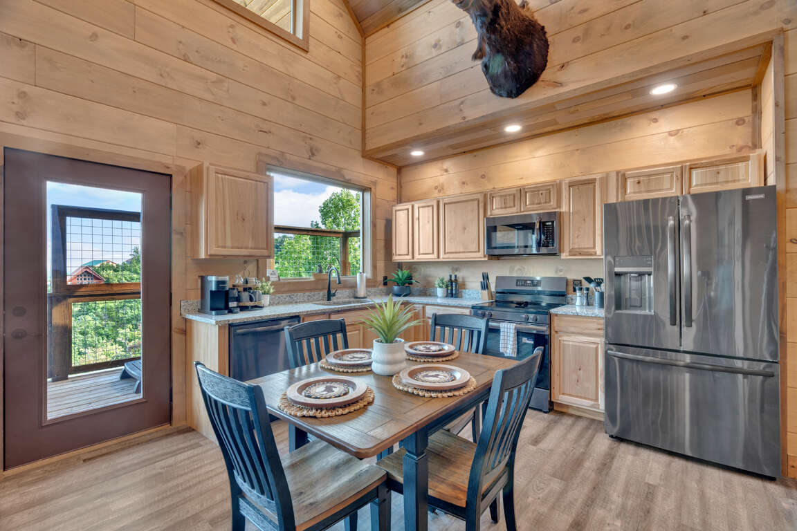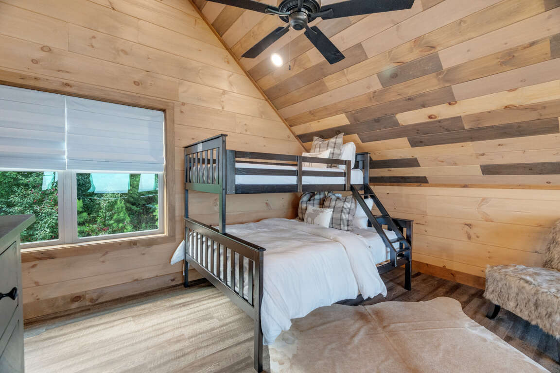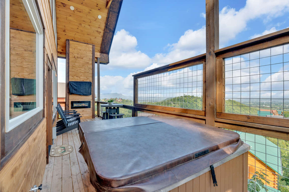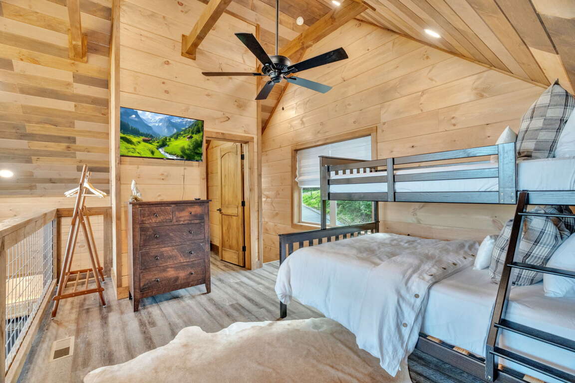 Spectacular Views, Hot Tub, Wifi, Outdoor Fireplace, Resort Pool Moose Top is a newly built, 2-story, luxurious 2 bedroom, 1.5 bathroom cabin with panoramic views of the Smokies. This cozy yet elegant retreat spans approximately 1,000 sq ft and is perfectly suited for couples or solo travelers seeking a peaceful mountain escape. The cabin is located near Dollywood and offers spectacular views, hot tub, Wifi, an outdoor fireplace, parking for 2 vehicles and access to the seasonal Resort Pool. Main Level: The main level of this cabin features the Kitchen, Living Room, 1 Bedroom, 1 Full Bathroom, the laundry closet and access to the deck. The Kitchen is fully equipped and offers granite counters and stainless steel appliances as well as a table to seat 4. The Living Room features 2 couches, an electric fireplace, HDTV and deck access. The Bedroom on this level offers a King bed, HDTV and access to the full bathroom. The Bathroom features a double vanity and step-in tiled shower. A charcoal grill is located just off the front porch for your convenience. Step out onto the deck where you will find a cozy fireplace, an outdoor HDTV, hot tub, seating and views for days! Upper Level: The upper level of this cabin features a loft bedroom with a Twin-over-Queen bunk bed, a half bathroom, HDTV and breathtaking views through the large windows. The seasonal Resort Pool is available between mid-May and mid-September. Guests are provided with a complimentary Luxury Pass, offering a free ticket daily to several of the area’s most popular attractions. See under AREA INFO for more details, rules, & restrictions. Be sure to explore other nearby attractions including Ober Gatlinburg, The Arts & Crafts Community in Gatlinburg, Anakeesta Gatlinburg, Dollywood, Splash Country, and The Island!