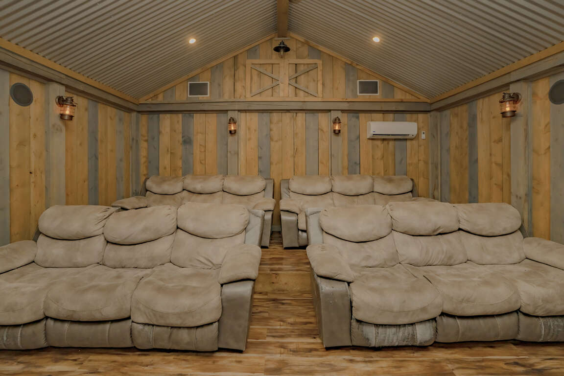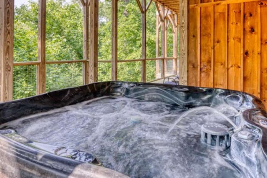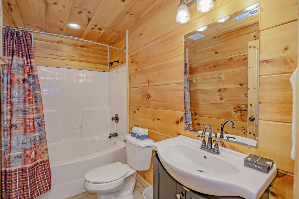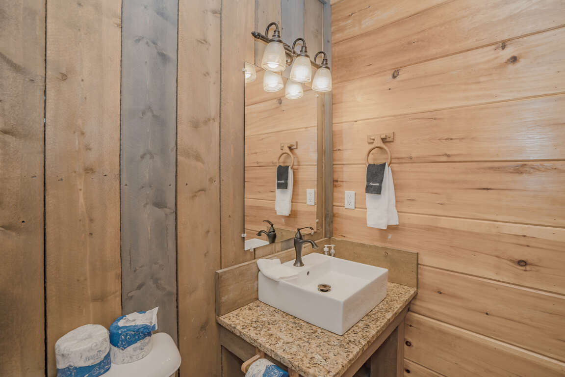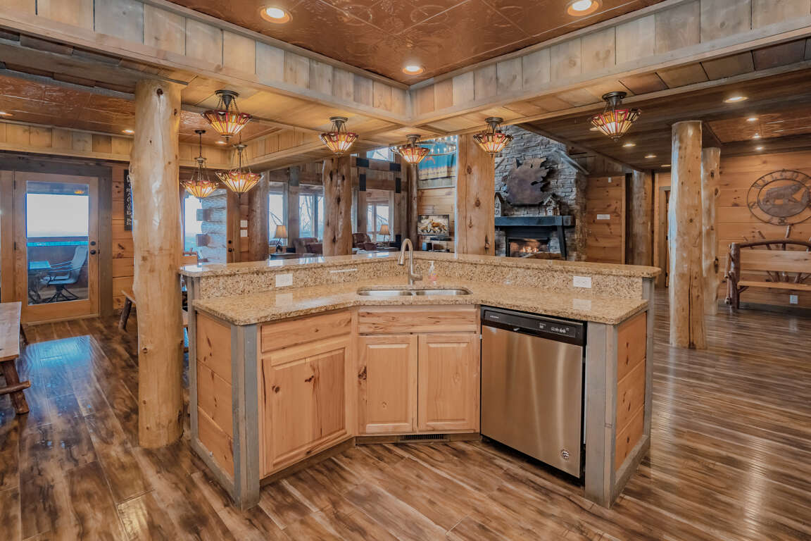 Indoor Pool, Mountain Views, Home Theater, Game Room, Wifi, Hot Tub, Yard with Fire Pit, Signature Series! Mountain Cascades Lodge boasts stunning mountain views, beautiful furnishings, rustic wood and steel finishes, top-of-the-line amenities, and custom touches throughout. There is room for 26 guests, and every bedroom features its own spa-like bathroom; a true retreat for every guest. Set on a private 5-acre lot, Mountain Cascades Lodge is a stunning 7-bedroom, 7 ½-bathroom mountain lodge featuring an impressive list of amenities, including a heated indoor-pool, home theater, game room, Wifi, Hot Tub, a yard with fire pit and amazing mountain views. In this industrial-style group lodge, no detail has been overlooked. Along with the restored-wood-look floors and tongue-in-groove white pine, Mountain Cascades Lodge features beautiful barn-style and reclaimed wood throughout. Each space in this industrial-style cabin has been beautifully designed, from the stone-and-log exterior and incredible indoor pool room to the elegant and gorgeous interior finishes. It's also just a few miles from downtown Pigeon Forge, offering convenience without sacrificing privacy. MAIN LEVEL: The main level features the living room, kitchen, dining, laundry, guest bath (half bath), 3 bedrooms, 3 full baths, outdoor covered dining area and access to the decks. As you step through the double front doors of this luxurious lodge, you'll be greeted by gorgeous views through the huge windows running all along the back wall. The elegant entryway is just the beginning of the high-end style found throughout the entire cabin. It features a large eagle carving, Western spruce pillars, and a log bench where you can sit to kick off your shoes. Here you'll also find a closet with iron and ironing board and the laundry room where you can wash swimsuits and towels after a dip in the pool or hot tub. The living room features plush leather sofas and comfy chairs gathered around a gorgeous stacked stone fireplace that runs all the way up to the soaring ceilings. A timber and steel mantle continues the industrial feel, and a large slice of redwood on the fireplace serves as a stunning piece of rustic art. On cool Smoky Mountain nights, curl up in front of the gas fireplace and enjoy the fantastic views through the windows. With huge windows all around, you won't have to miss the incredible mountain views when you want to stay comfortable inside. The spacious, fully equipped kitchen is a chef's dream. Large groups will find all they need for meals or snacks around the cabin, including two coffeemakers, two double toasters, a pantry, a Lazy Susan cabinet, and plenty of serving dishes, glasses, utensils, and cooking tools. The breakfast bar with log stools offer more seating and plenty of counter space for buffet-style meals. If planning a cook-out, the gas grill is located on the front porch of the lodge. The dining area features log dining tables with benches and chairs. The dining table, along with stools at the breakfast bar and a high-top table with four stools, provide enough seating for all 26 guests. Just off the kitchen, there is a guest bath (half bath) and a laundry room with washer and dryer for your convenience. There are 3 bedrooms on the main level. The 1st bedroom (Grand Teton National Park room) is just off the kitchen and features a king bed, HDTV and a private, full bath with tub/shower. The 2nd bedroom (Rocky Mountain National Park room) is to the left of the living room and features a king bed, HDTV and a private, full bath with tub/shower. The 3rd bedroom (Big Basin National Park room) is also to the left of the living room and features a king bed, HDTV, beautiful views and easy deck access through the glass door, and a private full bath with tub/shower. The covered deck is furnished with lots of cedar rocking chairs and an enclosed outdoor space featuring a dining table with cushioned chairs just off the indoor dining area. UPPER LEVEL: The upper level features a loft game room, home theater, 4 bedrooms, 4 full baths and a comfortable sitting area between the bedrooms. The game room overlooks the great room and offers a pool table, HDTV, pub table with chairs, a sleeper sofa and enjoys stunning views through the large wall of windows. The theater room features a large HDTV, Blu-ray player and comfortable leather seating. The kids will love curling up on the bean bags. It's the perfect spot to have a movie marathon or watch a big ball game. There is also a separate loft sitting area between 2 of the bedrooms. The sitting area offers comfortable chairs where you can enjoy some reading and a sleeper sofa for additional accommodations. There are 4 bedrooms on the upper level. The 1st bedroom (Yosemite National Park room) offers a king bed, HDTV, the most spectacular views in the cabin and a private full bath with tub/shower. The 2nd bedroom (Yellowstone National Park room) is the bunk room, which will be a favorite with the kids. It's furnished with 2 full-size custom-made bunk beds, HDTV, sleek tin ceilings, and a sleeper sofa for lounging or extra sleeping space. Next to the bunk room, a double bathroom boasts two vessel sinks and two separate two-piece bathrooms (with a toilet and tub/shower in each). The 3rd bedroom (Shenandoah National Park room) features a king bed, HDTV and a private full bath with tub/shower. The 4th bedroom (Grand Canyon National Park room) offers a king bed, HDTV, beautiful mountain views and a private full bath with tub/shower. LOWER LEVEL: The lower level offers an indoor pool, full bathroom, covered deck with hot tub and a yard with a fire pit. The pool room is spacious, luxurious and offers more than just a pool... Ranging from 3.5 - 5.5 feet deep, the 16' x 30' heated indoor pool features a wading area for kids, a beautiful waterfall feature, a log bridge, and stone details throughout. There is plenty of seating all around the pool room, including a dining table for six that's set