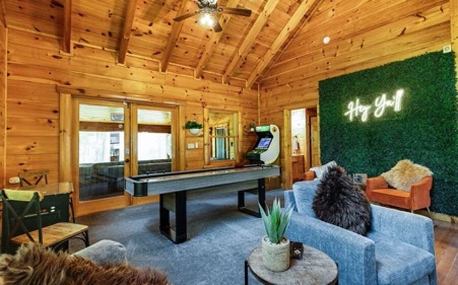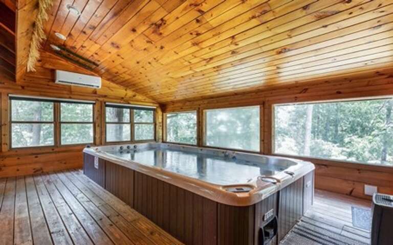 Indoor Spa-Pool, Honeymoon, Private, Hot tub, Wifi, Games, Fire pit, Single-story, Wooded View, Resort Pool Welcome to Huggie Bear Splash, a beautiful 1,200 sqft cabin where luxury and entertainment come together. This single-story, spacious honeymoon retreat features 1 large master bedroom, 1 full bathroom, sleeps 4 and offers top amenities like an indoor spa-pool, Wifi, games, hot tub, fire pit, access to the resort pool and more... The cabin is located in the Smoky Cove Resort in Wear’s Valley, just minutes from action packed Pigeon Forge! With parking for 4 and easy access into the cabin, Huggie Bear Splash is the ultimate Smoky Mountain honeymoon or small family getaway. The front porch features seating, a patio table and a gas grill for the perfect cook-out. Enter the cabin and discover a spacious living room, game area, kitchen, laundry, dining, 1 bedroom, 1 full bath, an indoor spa-pool and access to the back deck. The living room features an electric fireplace, HDTV and comfortable furniture, including a sleeper sofa. Just off the living room is the game area with shuffle board and arcade game. The kitchen is fully equipped with stainless steel appliances and the dining area offers seating for 4. A washer/dryer is located in the nearby laundry closet. The master bedroom offers a king bed, HDTV, electric fireplace, a private soaker tub and access to the full bathroom with shower. Just off the game room, enter the indoor pool room with a large spa-pool for hours of fun. Step out onto the back deck, gather around the gas fire pit or relax in the soothing hot tub. A few steps down into the backyard, you will find an inviting wood-burning fire pit with seating. Resort facilities include an outdoor pool and picnic area. Guests are provided with a complimentary Luxury Pass, offering a free ticket daily to several of the area’s most popular attractions. See under AREA INFO for more details, rules, & restrictions. Be sure to explore other nearby attractions including Ober Gatlinburg, The Arts & Crafts Community in Gatlinburg, Anakeesta Gatlinburg, Dollywood, Splash Country, and The Island!