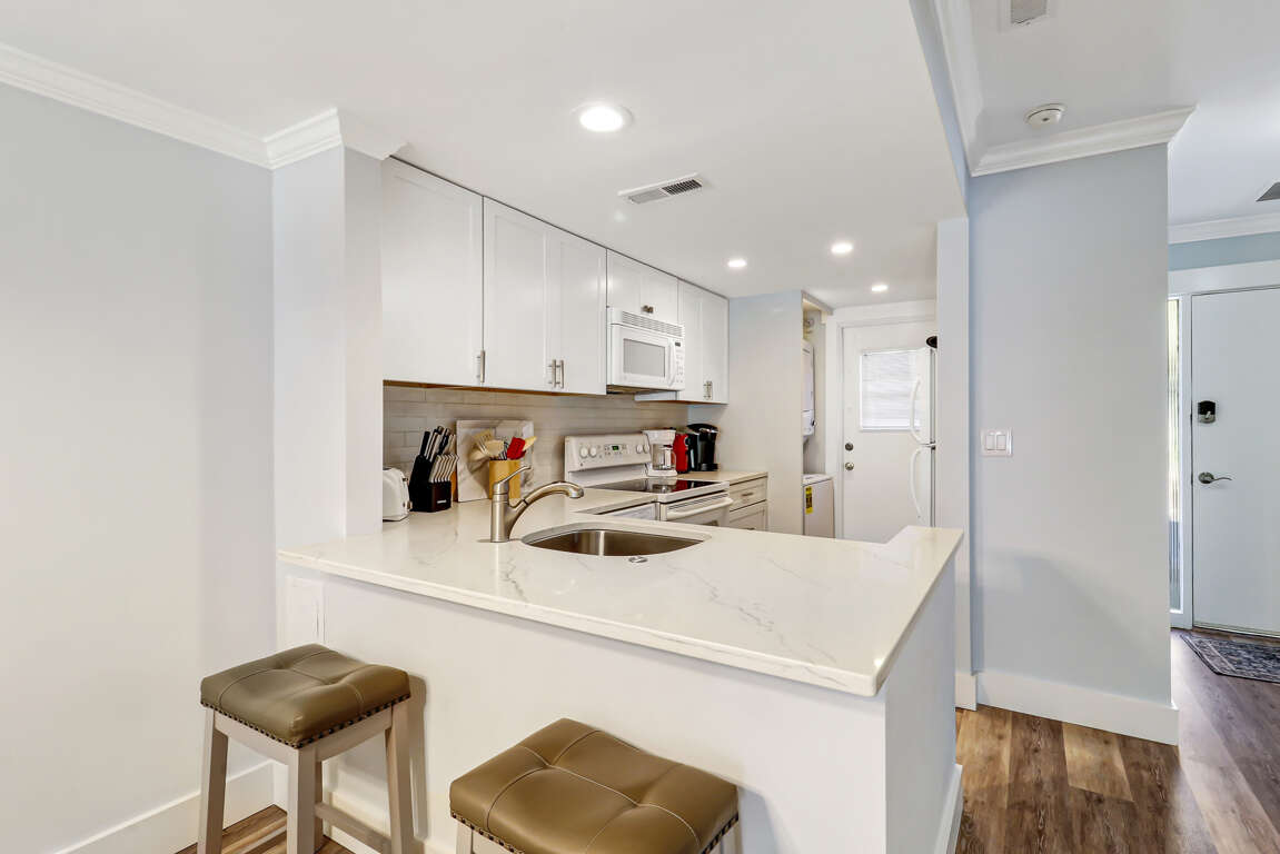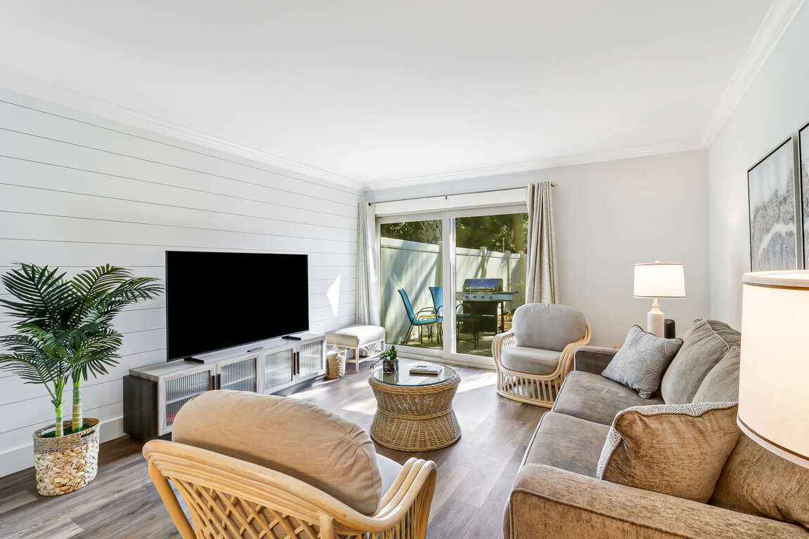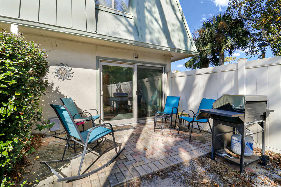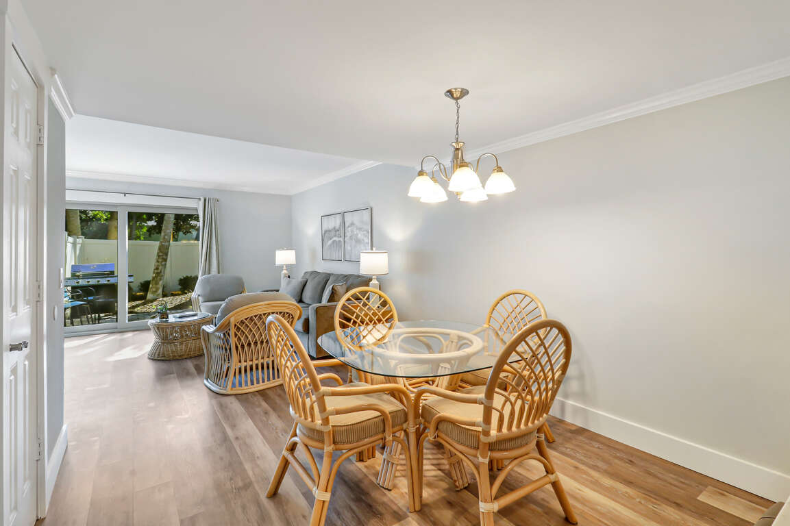 The Hilton Head Cabana 48 offers a delightful property with a range of amenities that will ensure a comfortable and enjoyable stay for guests. The first highlight is the remodeled kitchen, which has undergone renovations and upgrades, providing guests with a modern and functional space to prepare meals. The kitchen features newer cabinetry and full-size appliances, making it convenient for those who enjoy cooking. Another key feature of this property is the open floor plan, creating a spacious living area that is perfect for relaxing and entertaining. The living room is furnished with comfortable seating and a flat-screen TV, providing a cozy space to unwind after a day of exploring Hilton Head. The dining area, with seating for four, is ideal for enjoying meals together. For those who prefer outdoor living, there is a patio with a gas grill and chairs overlooking the courtyard, where guests can enjoy the peaceful surroundings.