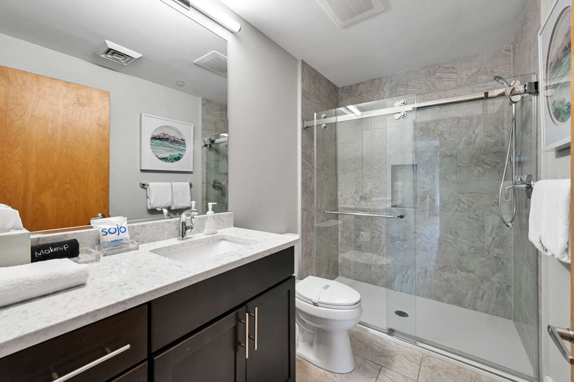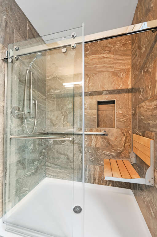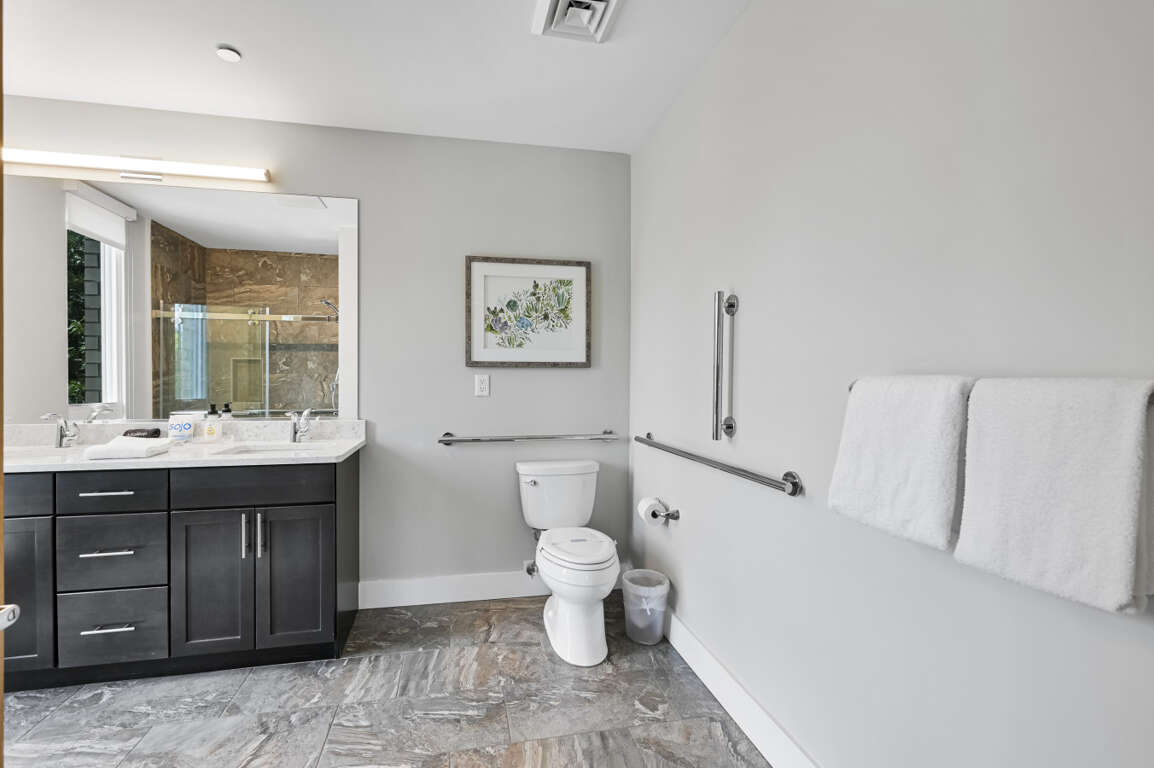 Wide doorways accommodate wheelchairs and the large Master Bath has a walk-in shower with bench and grab bars. Living room includes a queen sleeper sofa to accommodate additional guests.