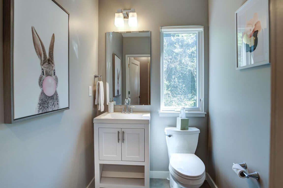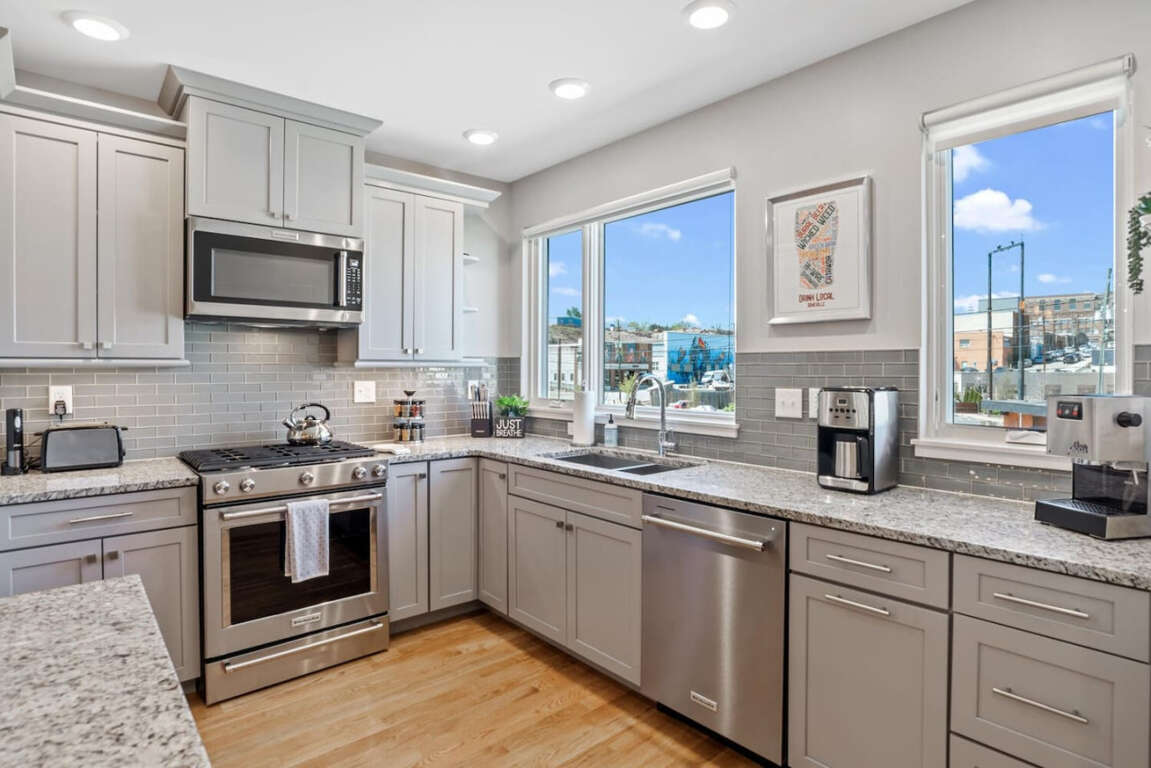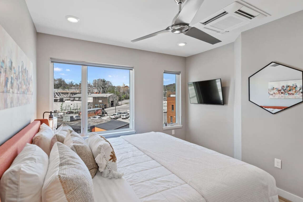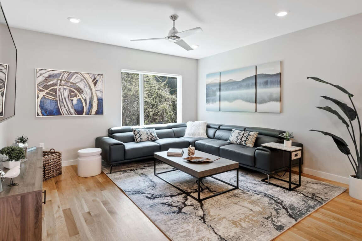This 1615 sq ft Asheville townhouse boasts modern luxuries: Internet access, air conditioning, two king beds, EV charger, and a fireplace.
