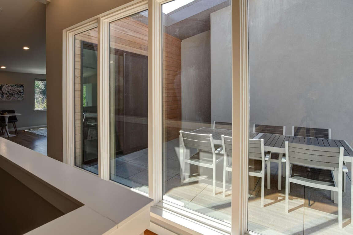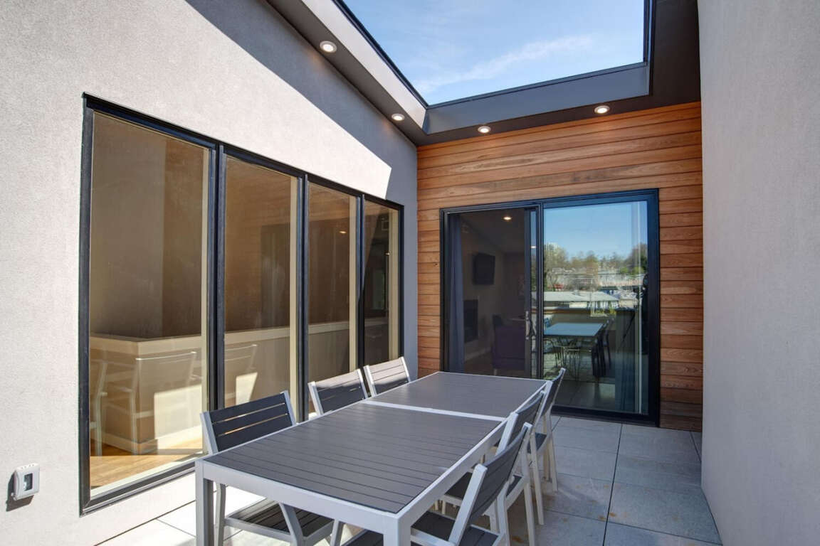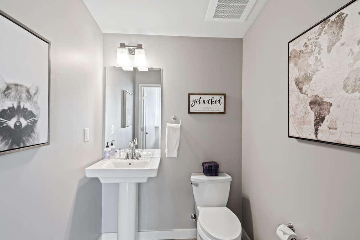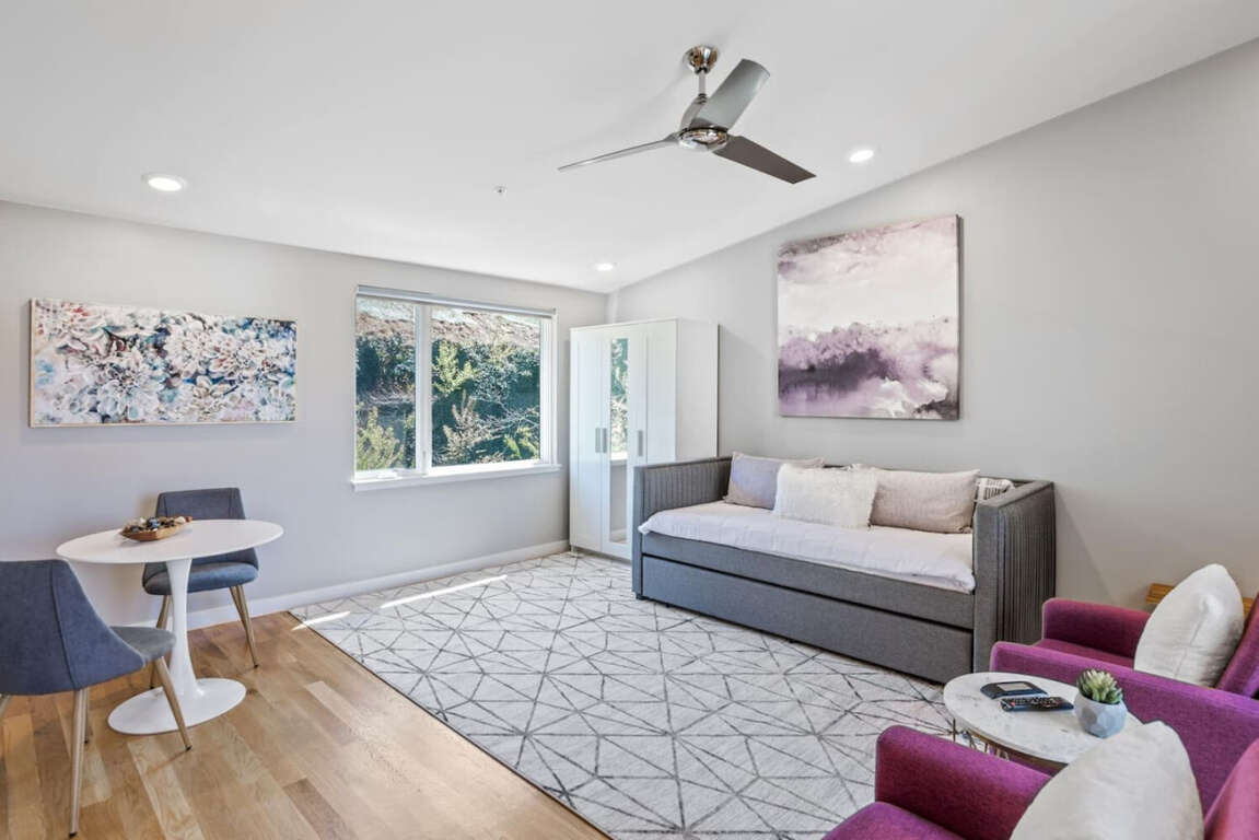 This 1615 sq ft Asheville townhouse boasts modern luxuries: Internet access, air conditioning, two king beds, EV charger, and a fireplace.