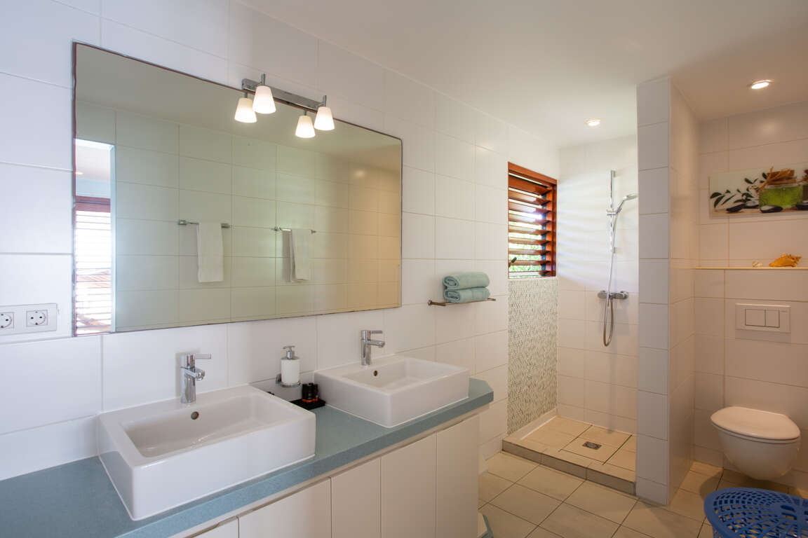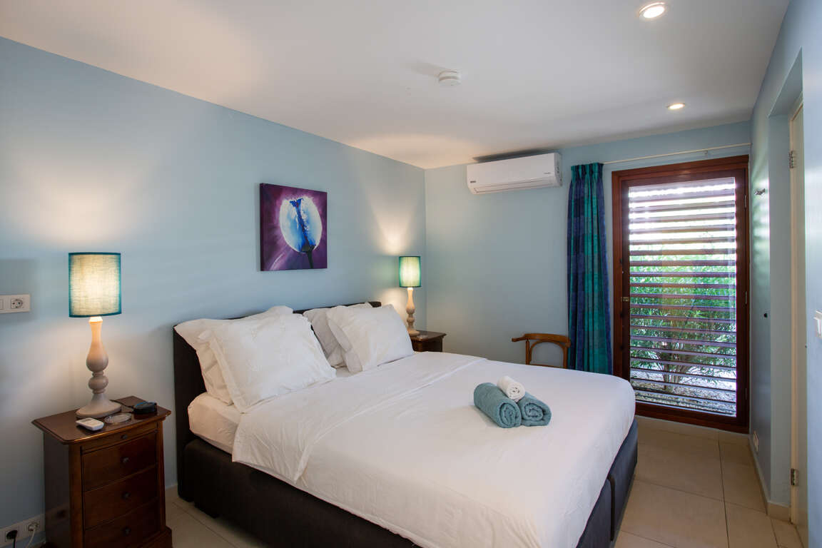 The villa has 4 bedrooms with air conditioning, three bathrooms, an outdoor shower, a large kitchen with all comfort amenities. The large lounge has a great view of Willemstad, Curacao, and Sea Aquarium. The living room is surrounded by the Caribbean sea and the villa has a wonderful tropical garden. Parking is right in front of the villa. The large tiled pool terrace and the large oval infinity swimming pool make it complete. At night the infinity pool offers an abundance of colorful lights.