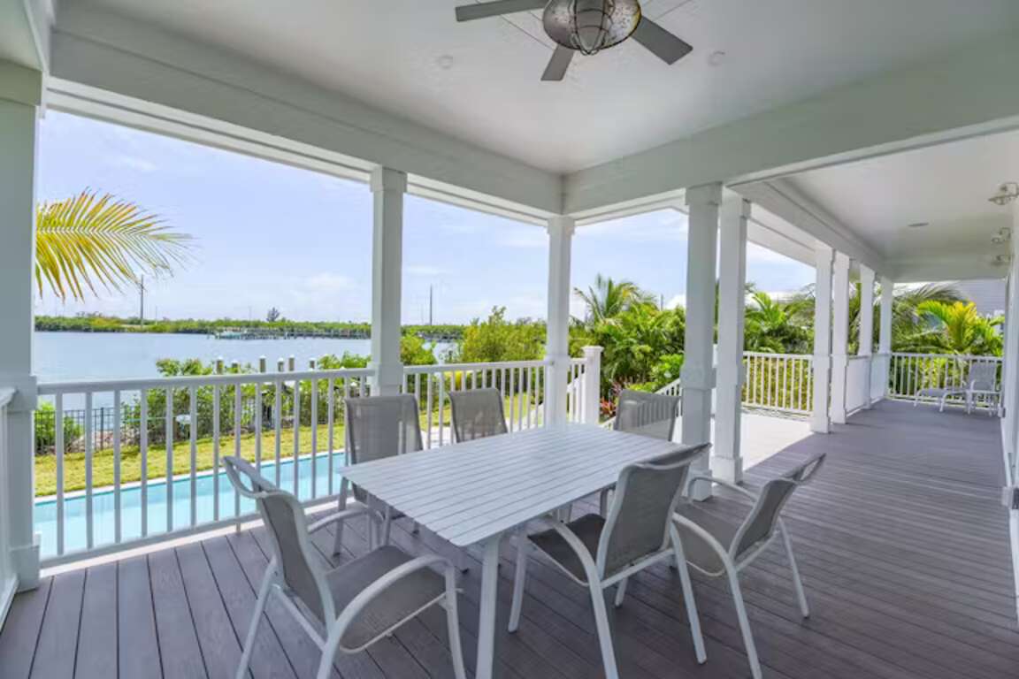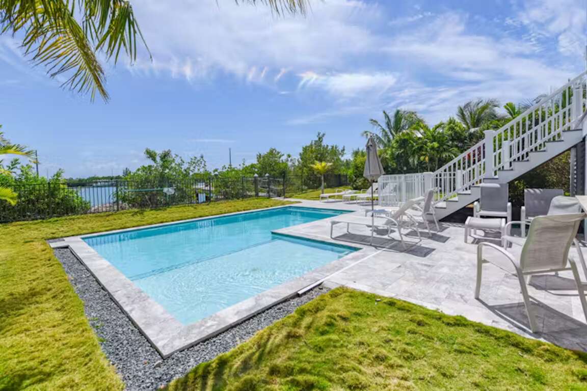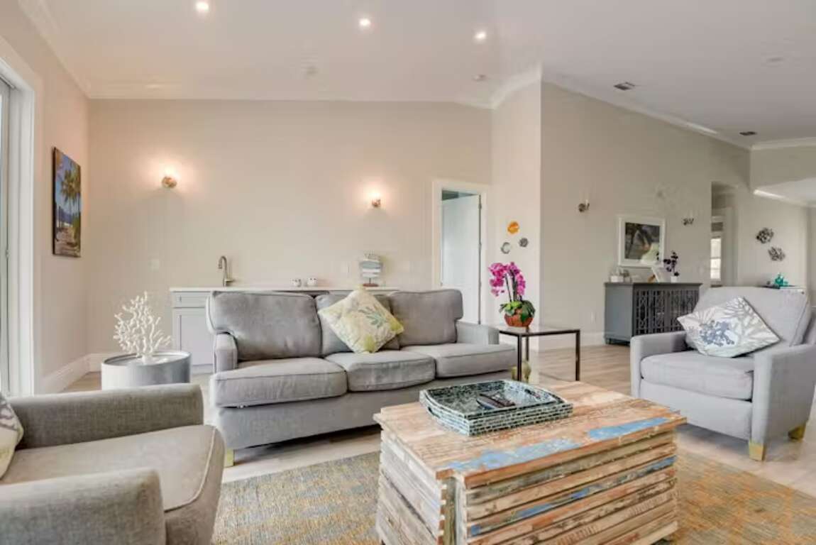 Waterfront villa vacation rental in Key West with a private pool and 50-ft dock in a gated community, less than a mile from Old Town, with an open-plan living area and a gourmet kitchen.