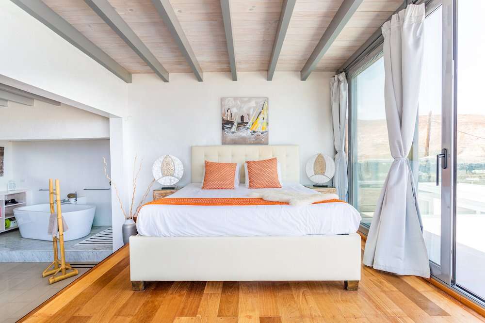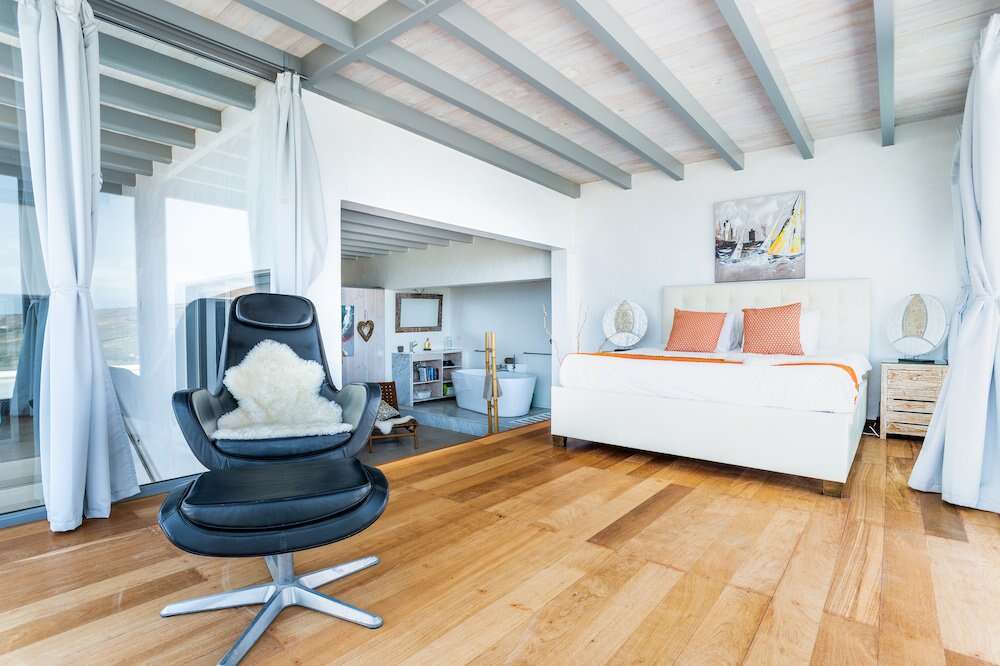 The Master Sanctuary: An outstanding suite with floor-to-ceiling windows. The upper level features hardwood floors and a king-size bed, while the marble-floored lower level boasts a free-standing bath, walk-in wardrobe, and en-suite wet room.