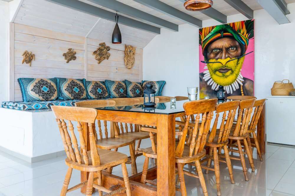 Dining Options: An indoor setup for 12 guests and an authentic Moroccan-style outdoor terrace room with a dining table and day beds.