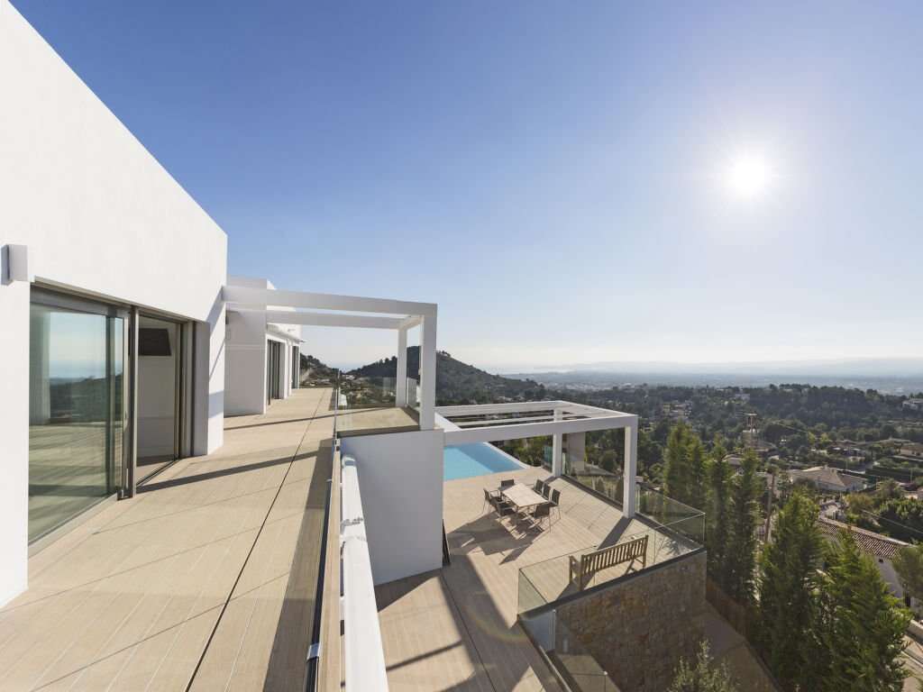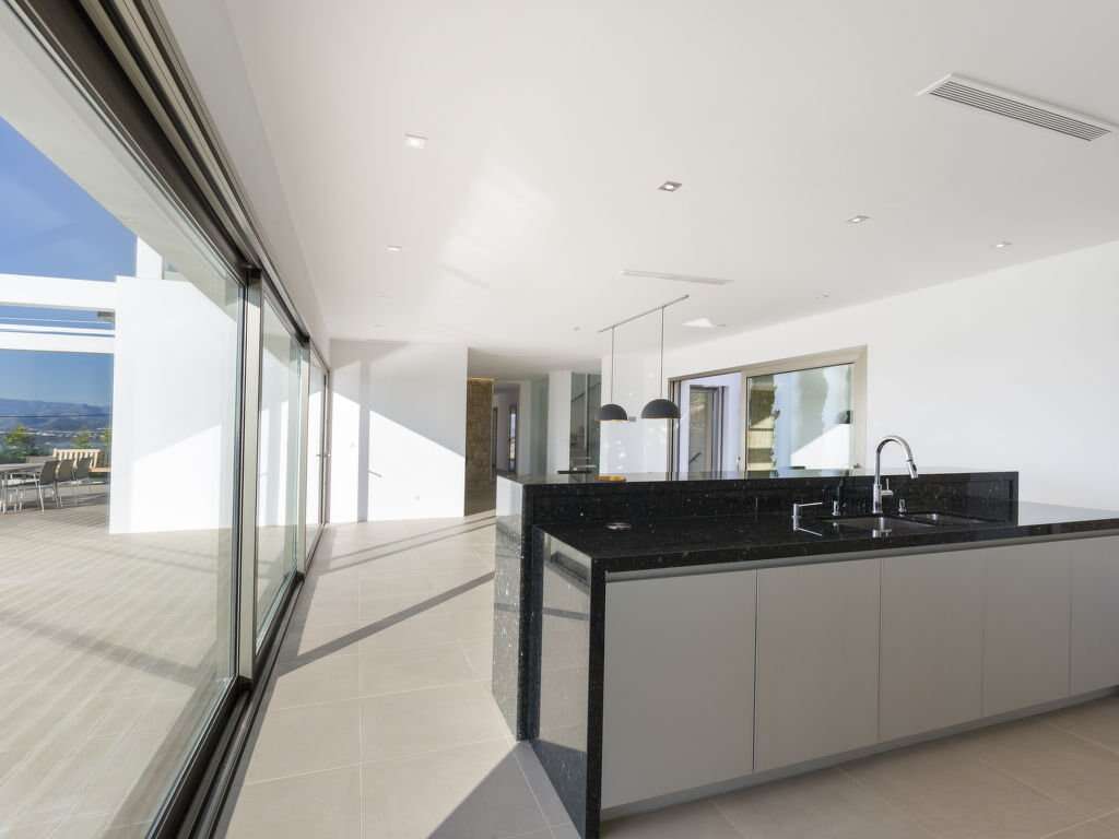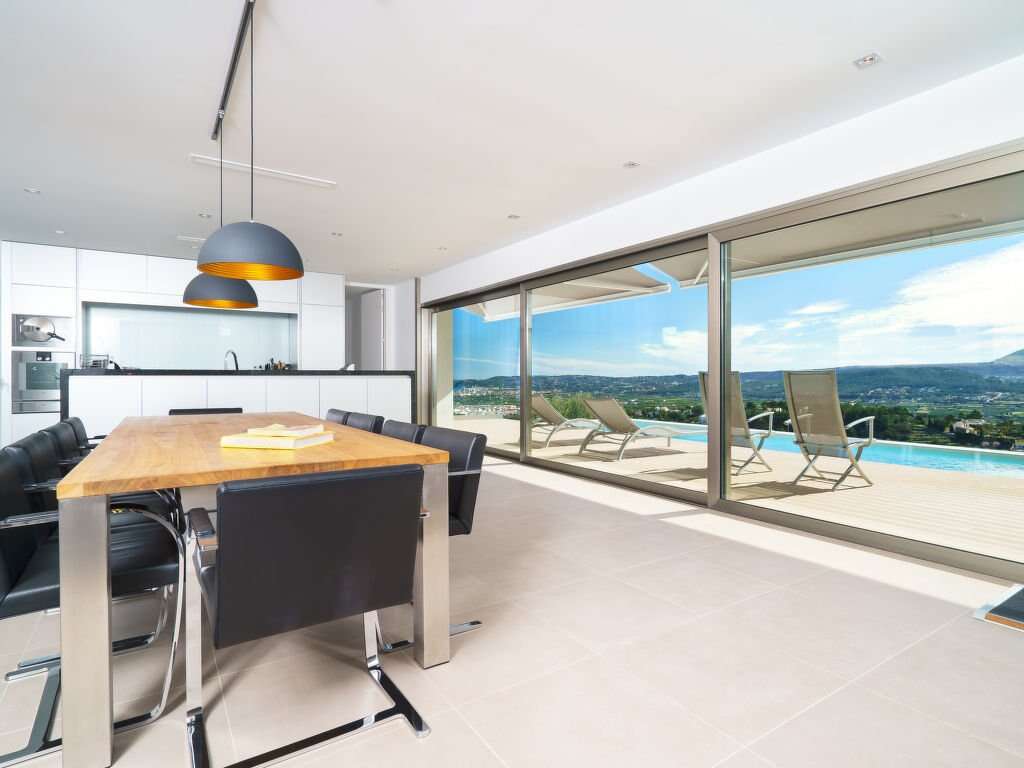 Modern villa vacation rental in Javea with 4 bedrooms, heated private pool, lift, and panoramic sea views from multiple terraces; set on a quiet slope about 3 km from the sea and local beaches.