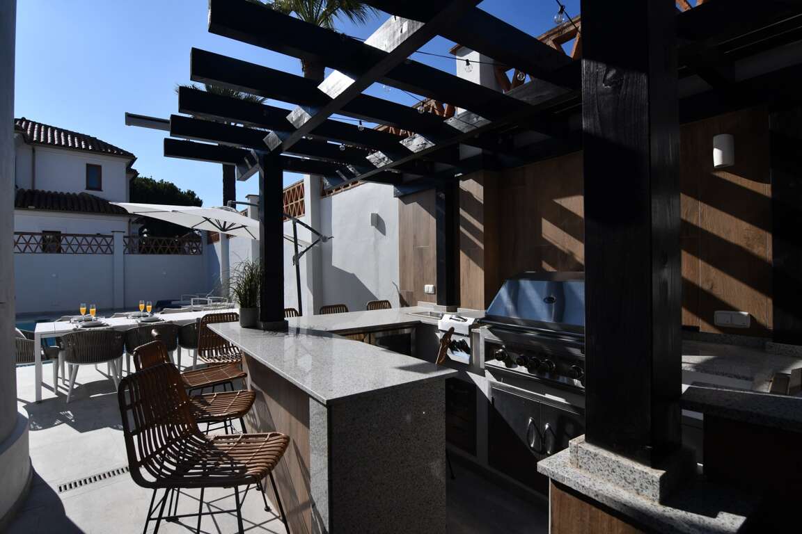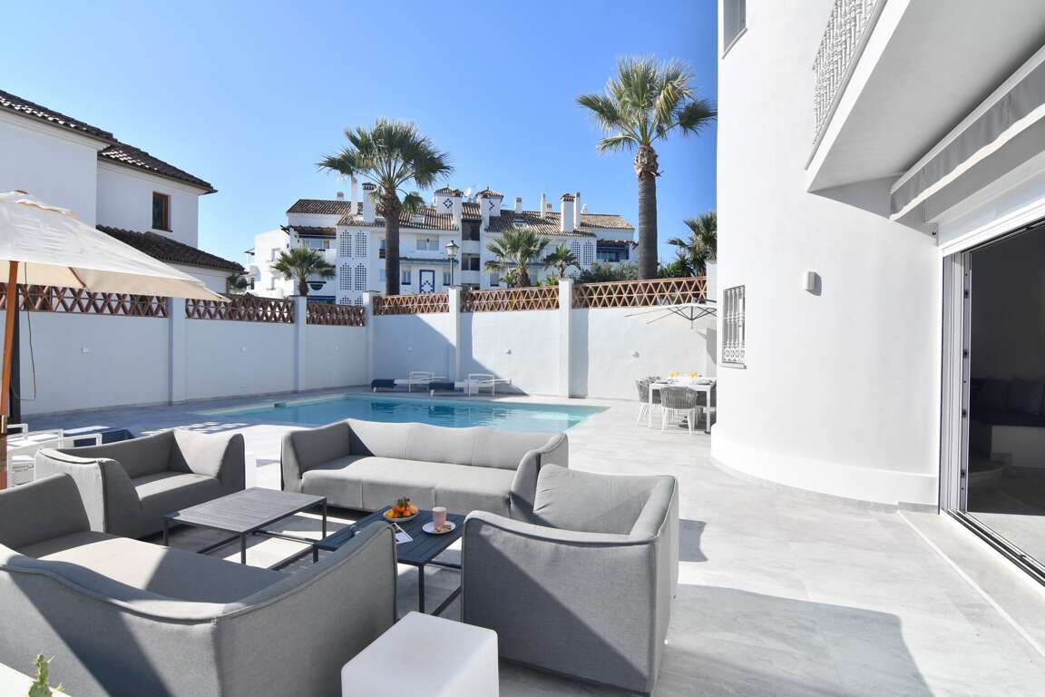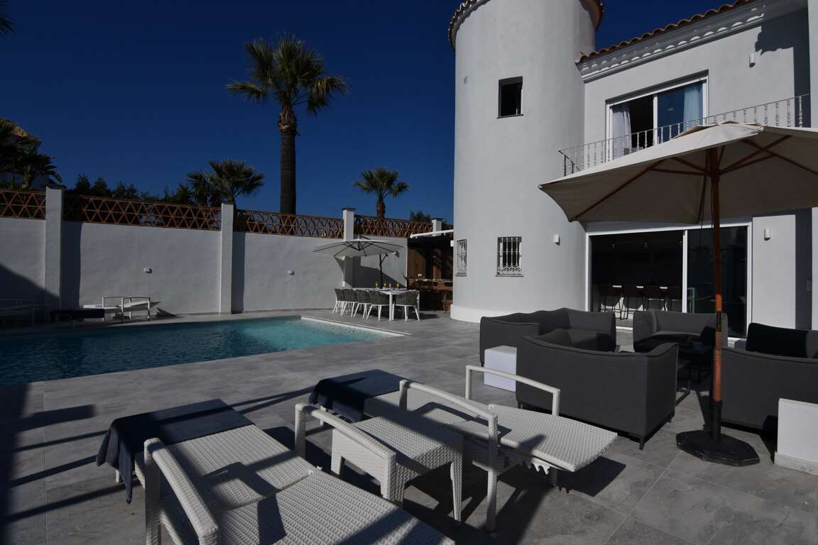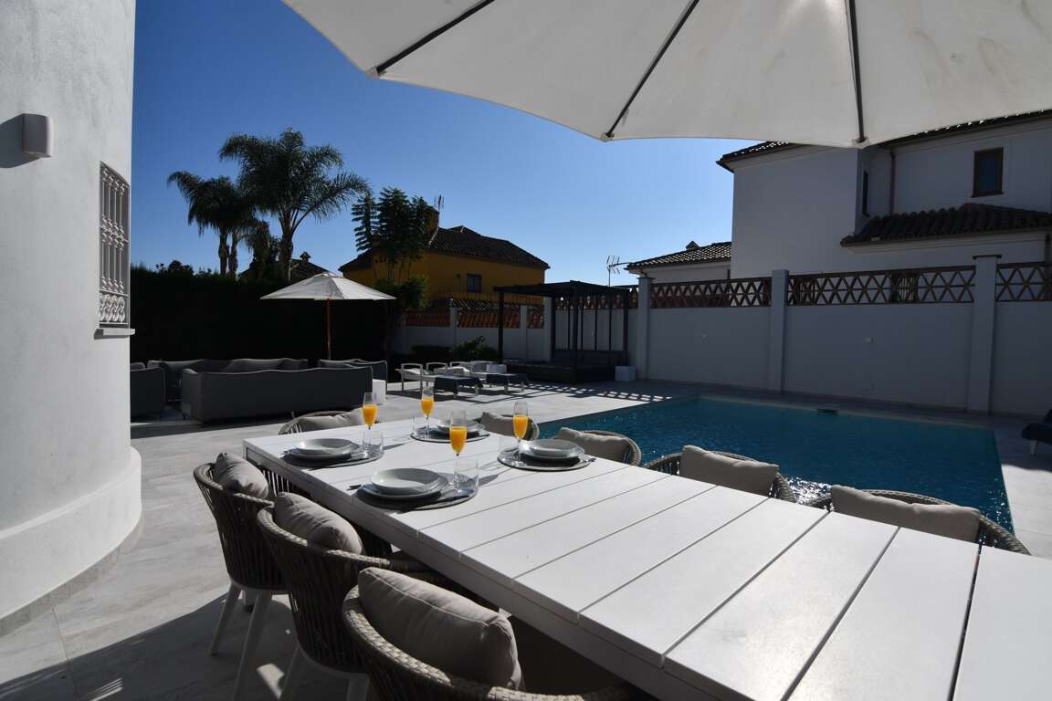 Villa vacation rental in Marbella with 5 bedrooms for groups, featuring a private pool, fenced garden, and sea views, set in Las Chapas near the coast and a short drive from Marbella center.