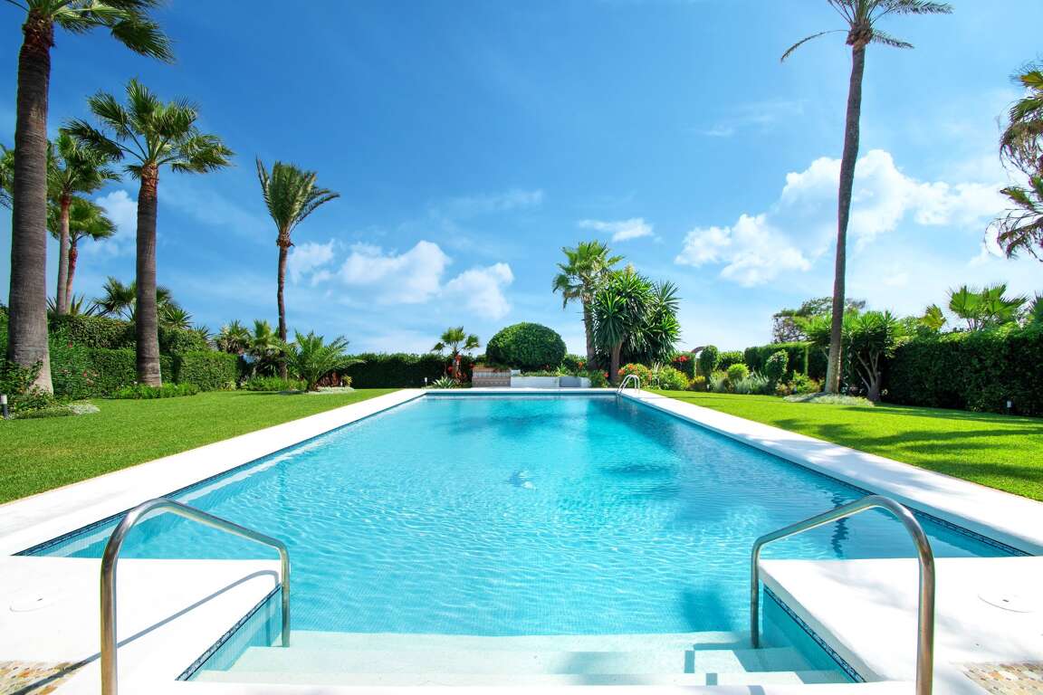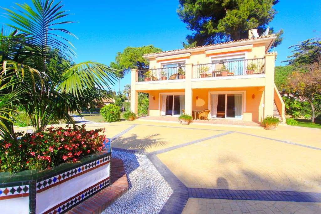 Beachfront place to stay in El Paraiso, Estepona with 2-bedroom villa layout, private pool, and direct sand access; a beach house rental on a large estate near restaurants and shops.
