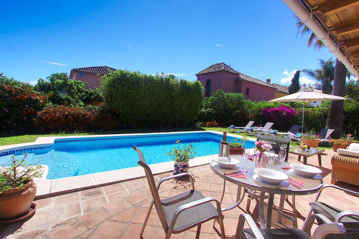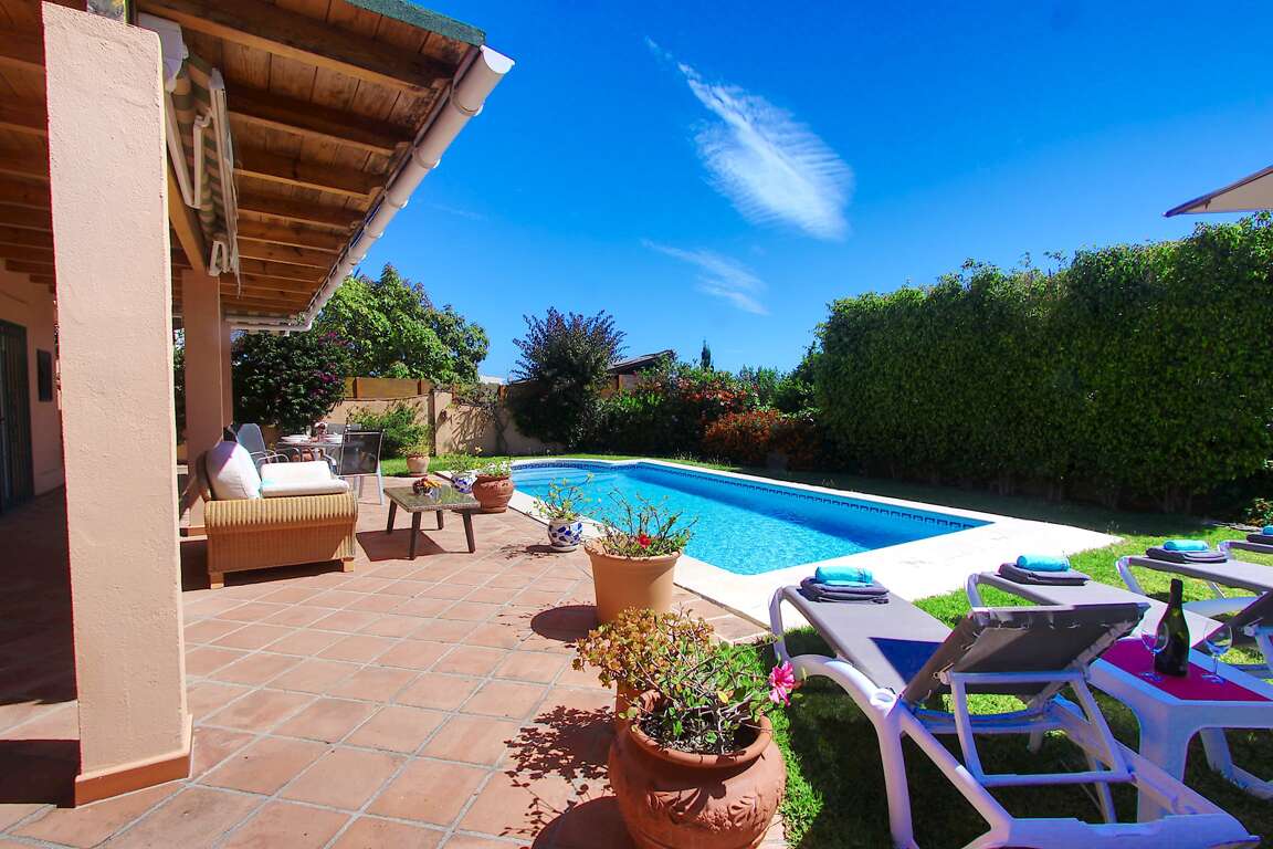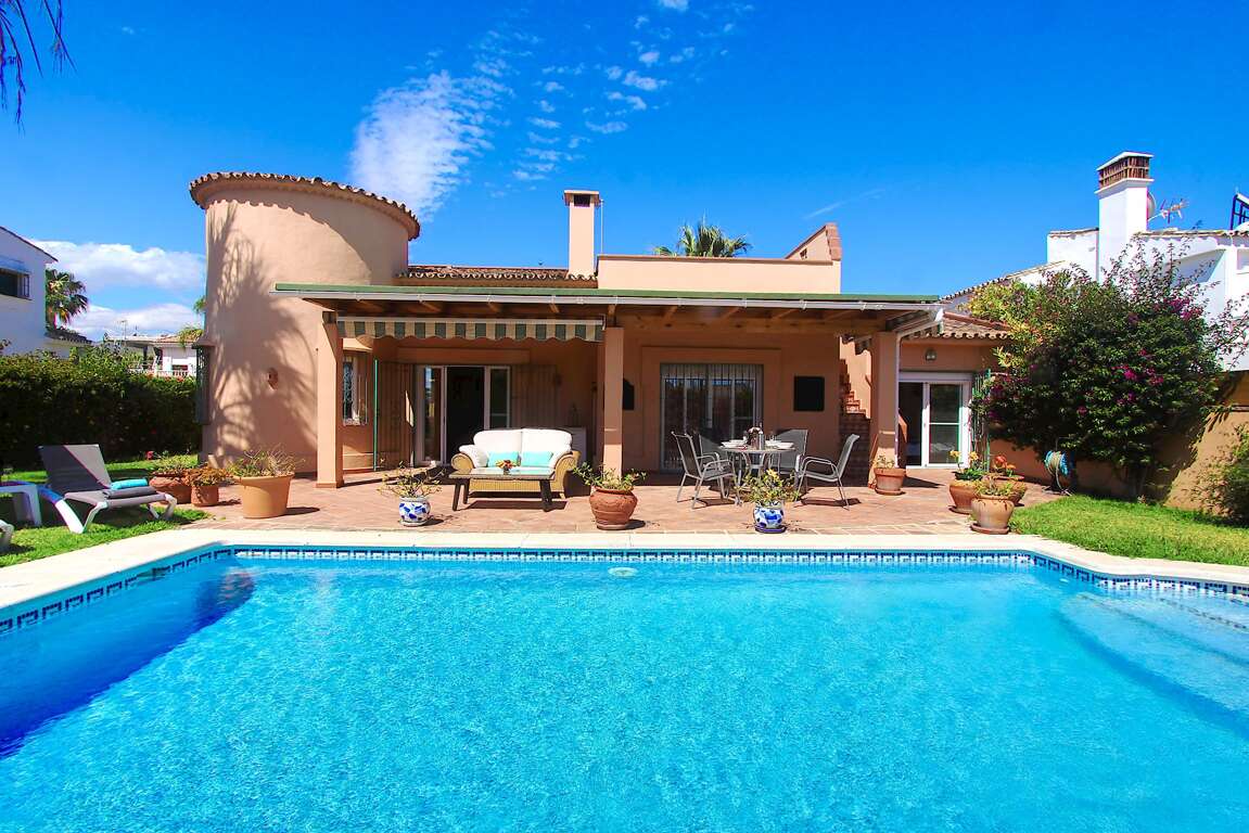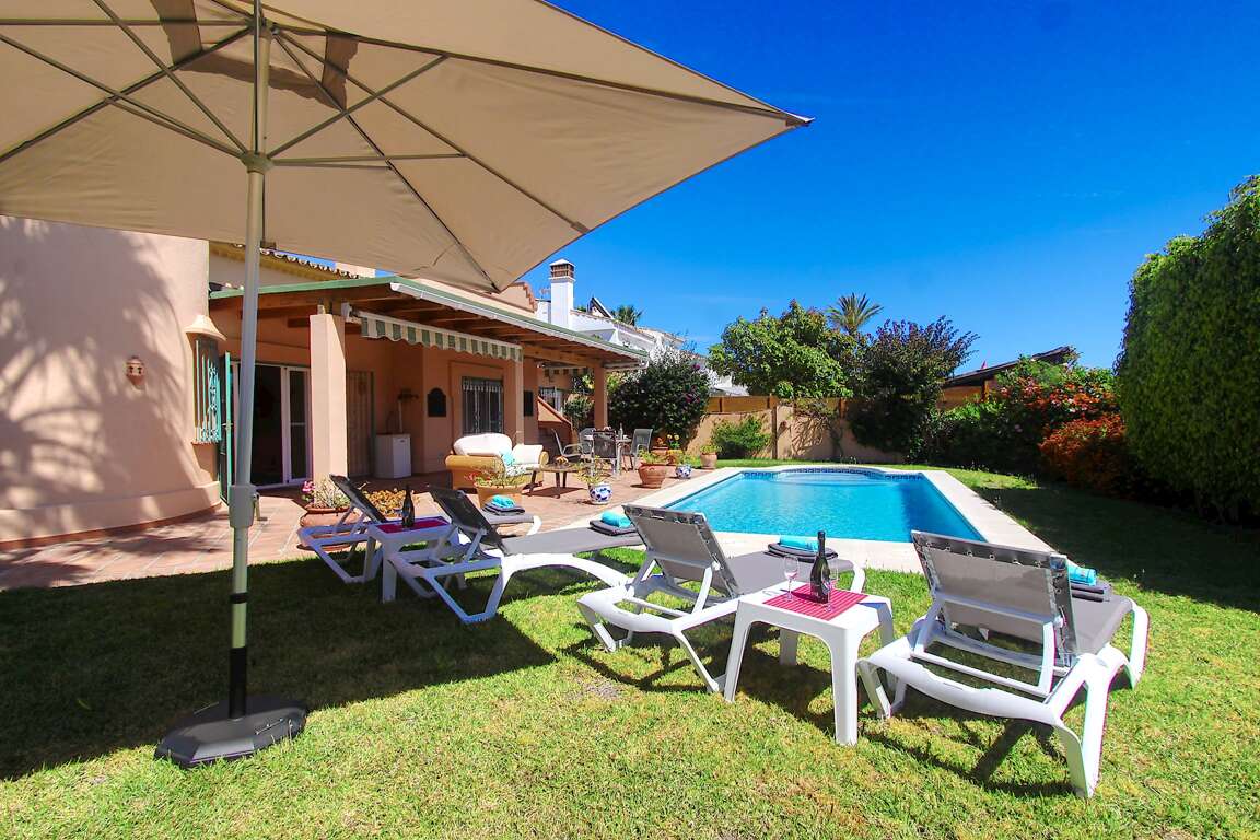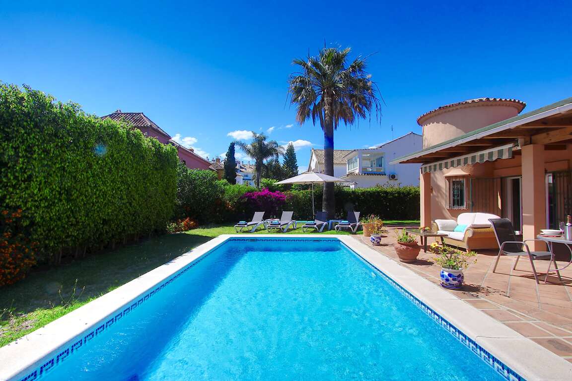 Villa vacation rental in Marbella with a main house plus private annex, roof terrace views, and a fenced pool garden; walk 300–400 m to beaches, beach clubs, supermarkets, and nearby gyms.