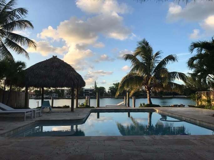 Waterfront villa home in Miami with a private dock, heated pool, and gear for the water; a practical place to stay near Bal Harbour Shops, with bikes for the short ride to the ocean.