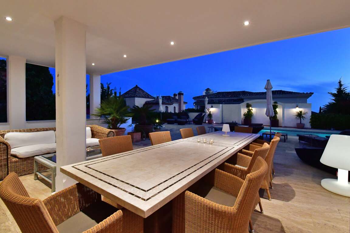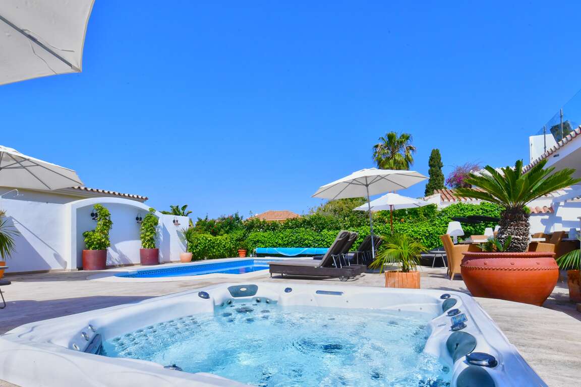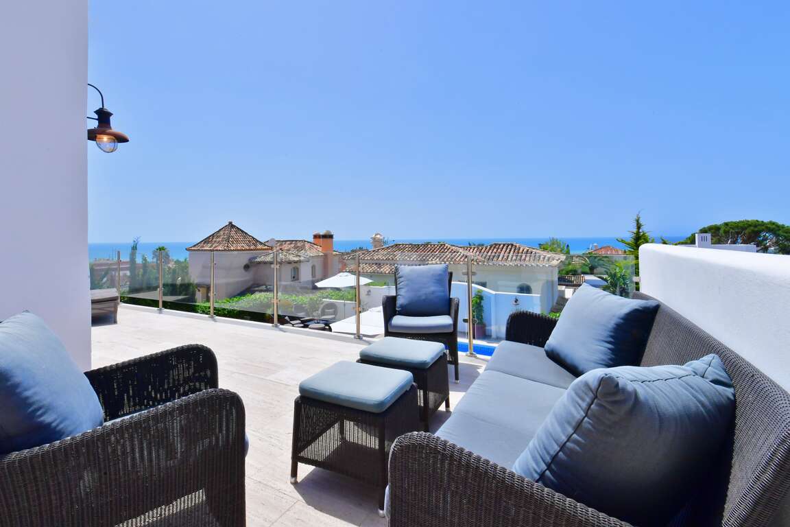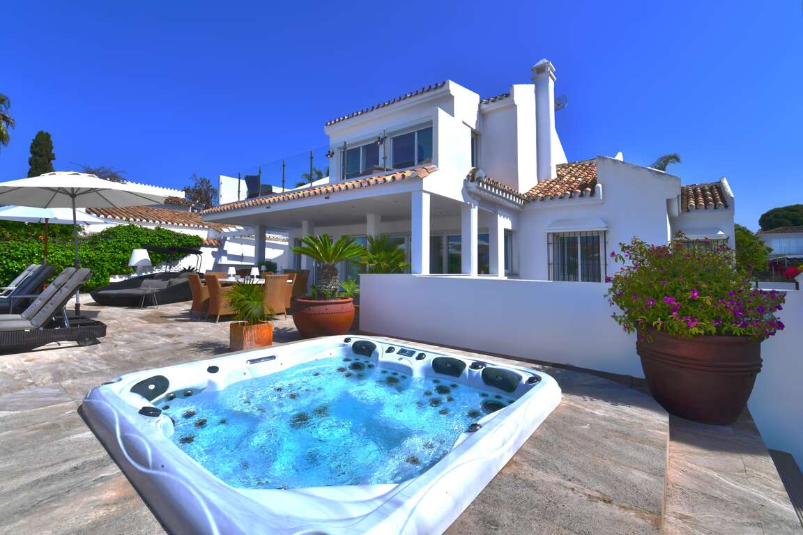Villa vacation rental in Marbella with 6 bedrooms for groups, featuring a heated pool, jacuzzi, and large sea-view terraces on a private fenced plot near El Rosario and Puerto Banús.