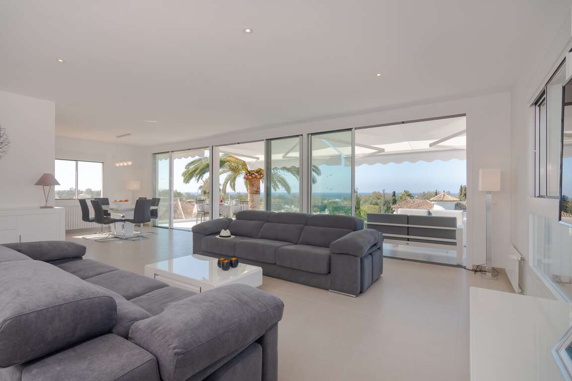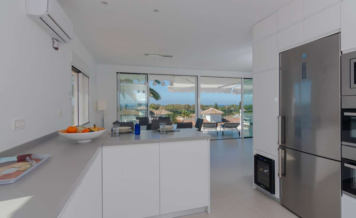 Refurbished to high standards, this villa captures the essence of luxury living in Marbella. Upon entering, the house reveals a bright, open-plan living space and a fully equipped modern kitchen, both designed to frame the marvelous views of the Mediterranean Sea. The property balances sophisticated interiors with a cozy, multi-leveled outdoor area, making it a fantastic home for holidays with family or friends.