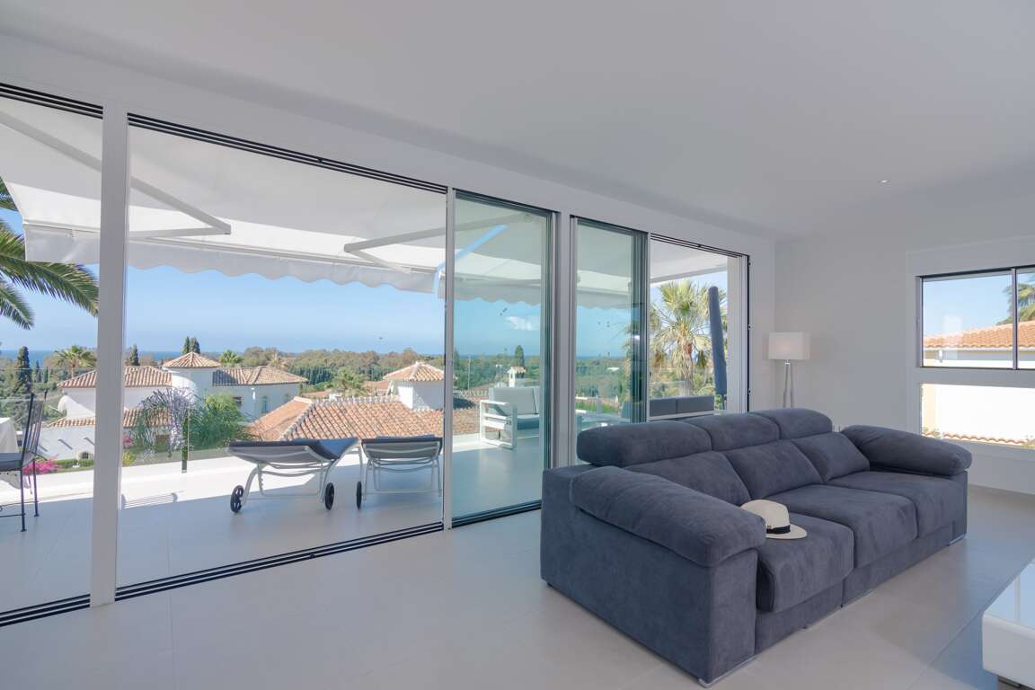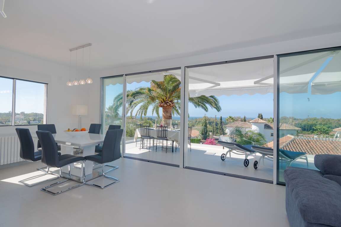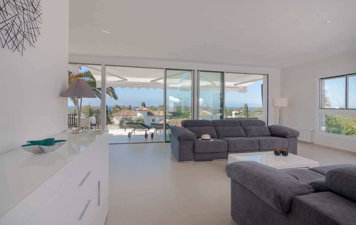 Mediterranean villa vacation rental in Marbella with 4 bedrooms on two levels, sea-view living areas, and direct terrace access to a private pool; close to Elviria beaches, golf, supermarkets, and bus stop.