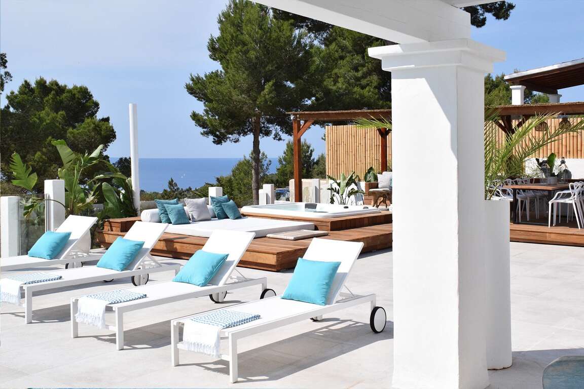 Villa vacation rental in Sant Josep de sa Talaia with five bedrooms across multiple levels, sea panoramas over Es Cubells, plus a pool and jacuzzi, outdoor kitchen, and easy access to nearby coves.