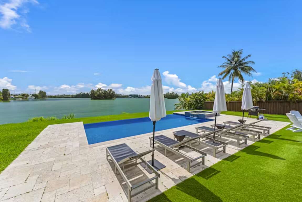 Lakefront villa home in Miami with five suites, infinity pool, and hot tub, offering a quiet place to stay near beaches, dining, and nightlife; concierge can arrange spa treatments, chefs, and housekeeping.