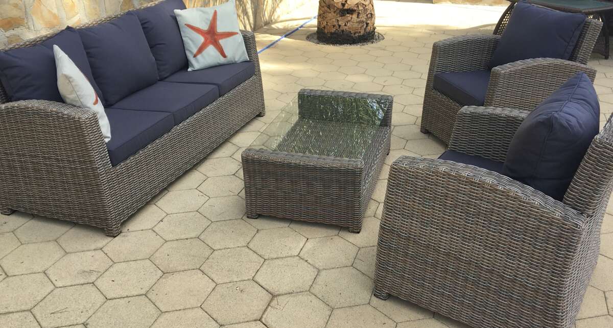 Gardens & Naya: A comfortably furnished Naya patio leads to a large established garden with palm trees, a stylish stone dining set, and a BBQ area.