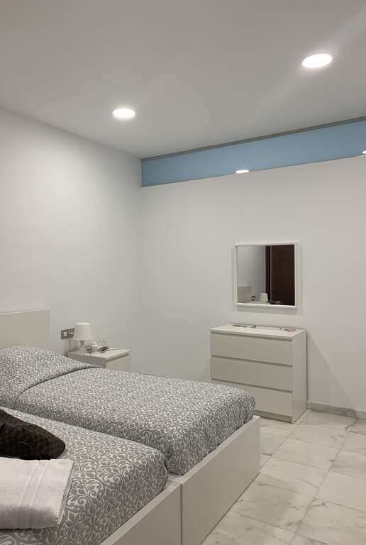 Main Floor: Features a bright living room with comfortable sofas and a fully equipped American-style kitchen with a bar. This floor hosts a double bedroom and a massive master suite with a large en-suite bathroom.