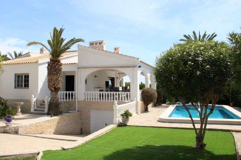 Plantation-style villa rental with private pool and garden terraces in Villamartin, CA, a convenient place to stay near Villamartin Plaza, golf courses, and Blue Flag beaches within 3 km.