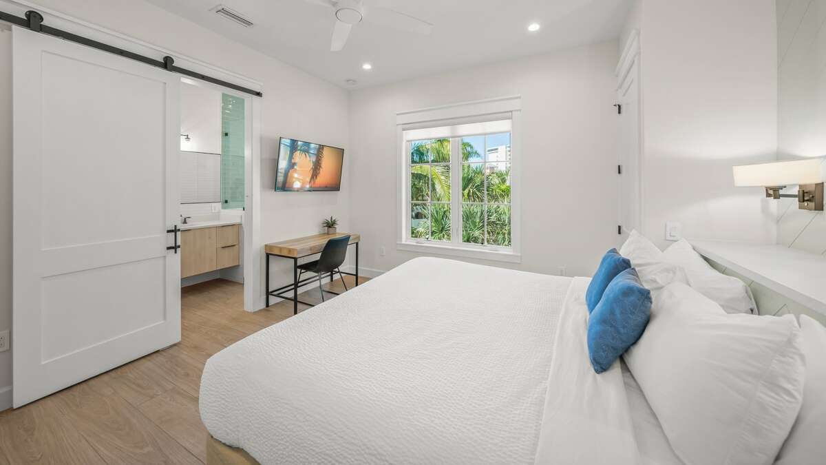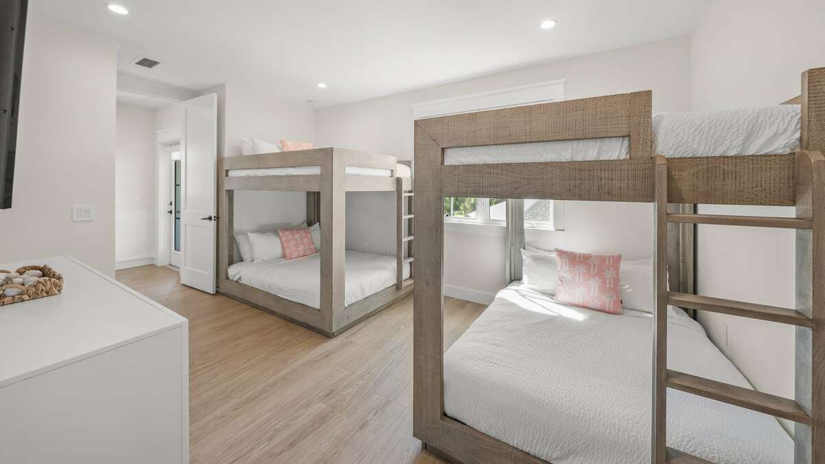 The Club Room features a Wet Bar with 8 Seating, a Living Area with large Smart TV and Gaming Consoles - Nintendo and PS4, as well as Balcony Access with views of Siesta Key Beach and the Gulf of Mexico. This floor also has 4 bedrooms. Bedrooms 4, 5, and 6 have King beds, Smart TVs with en suite baths and walk-in showers. Bedroom 7, the final Bedroom, is the Bunk Room. It has 2 Full Over Full Bunk Beds and an en suite bath with a shower/tub combo.