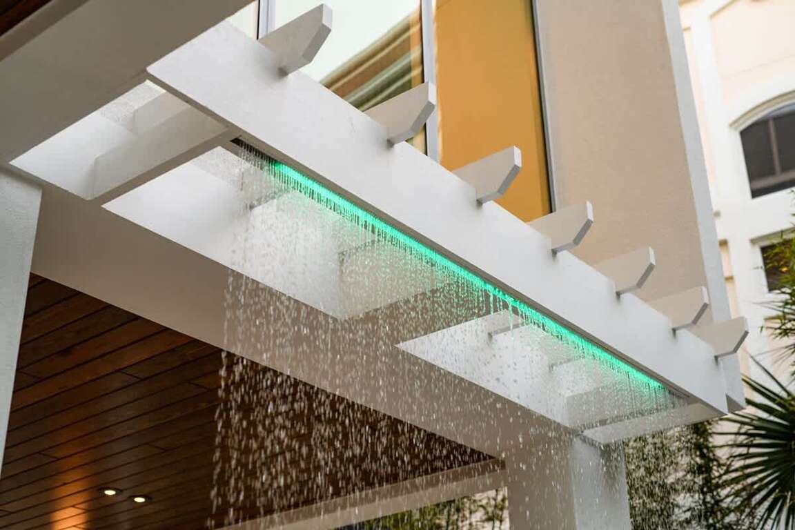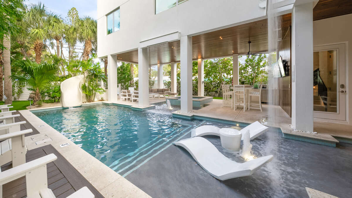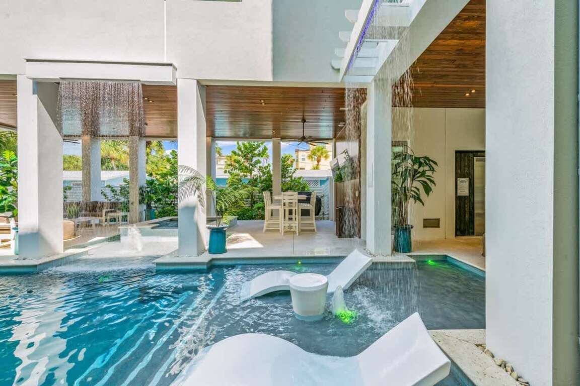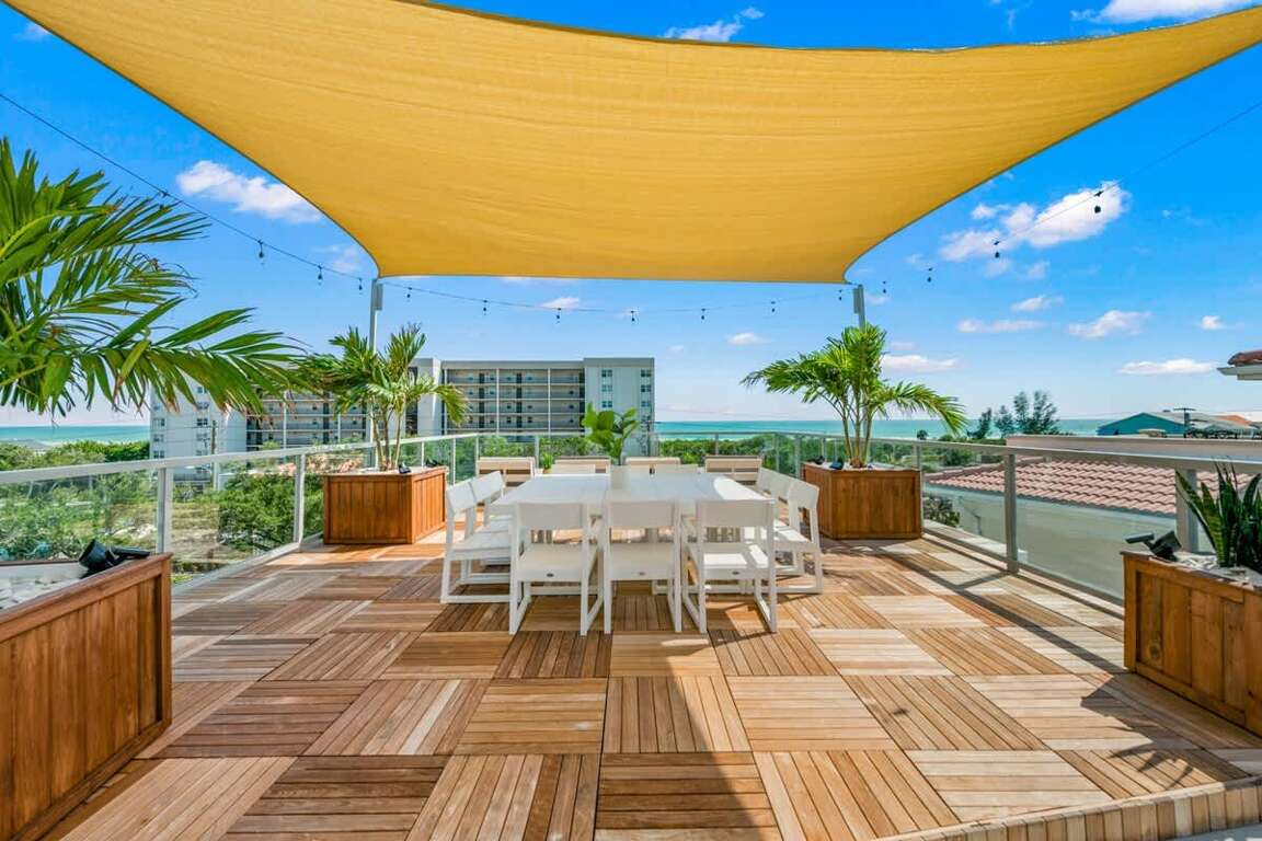 The Roof Top Deck and Multiple Levels of this Nearly Beachfront Siesta Key Luxury Rental Property offer views of Siesta Key Beach, the Gulf of Mexico and the property. This luxury rental on Siesta Key is only a few steps from Siesta Key Beach, and about a three-minute walk to Siesta Key Village. The luxury vacation rental is also located near a trolley stop for easy and free transportation throughout the Key. Location is unbeatable. The home has approximately 3,900 square foot of interior living area and an additional 2,800 sq ft of outdoor living space divided between multiple covered patios, balconies, entertainment spaces, and of course, the Pool. The exterior of the house has a heated pool with a waterslide and two sun-shelf splash zones, as well as a covered patio and open air patio. There is also a 6-person spa and two water curtain features. This Siesta Key rental offers a variety of outdoor options, including a pool area, multiple balconies and the roof-top deck. You can sunbathe, lounge and enjoy Florida weather at any time.